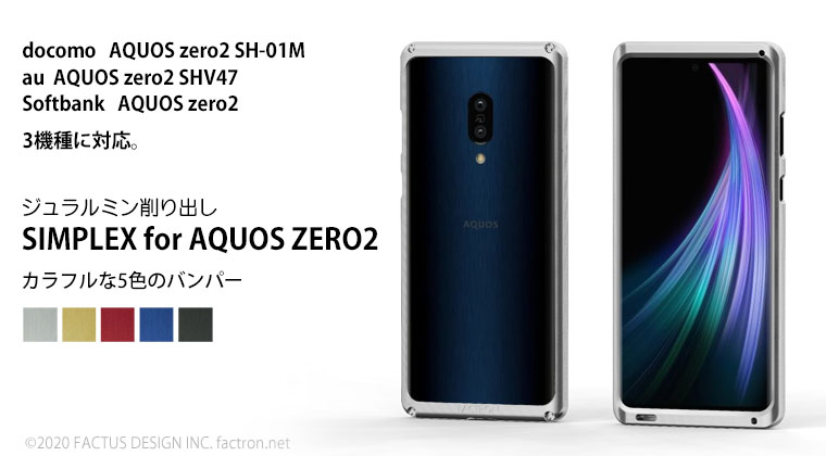 ※このモデルは販売終了しました SIMPLEX for AQUOS zero2 docomo AQUOS zero2 SH-01M au AQUOS zero2 SHV47 Softbank AQUOS zero2 3機種対応のジュラルミン削り出しバンパー。 AQUOS のためのハイクオリティデザインです。 一枚のジュラルミンの無垢材から時間をかけ 一つ一つ削り出し、手作りで仕上げるこだわりのフォルムは、 所有する価値を高めてくれます。