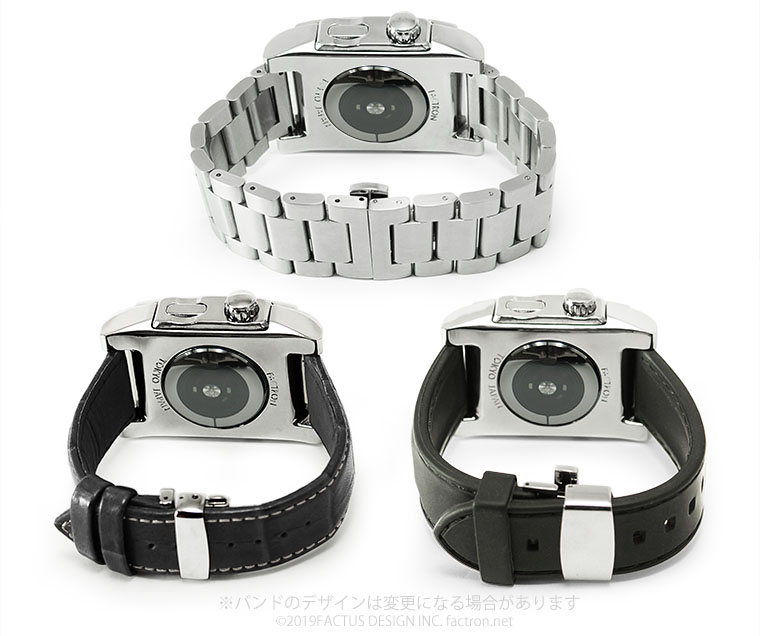 重厚なステンレススチール製メタルバンド(上) クロコ型押しの高級天然牛革のレザーバンド(左下) 汗や水に強いレザーバンド風ウレタンバンド(右下) 全てのモデルにプッシュ式三つ折れバックル付き また、市販の時計バンドも使用することができます 裏側ジャケットで覆い、FACTRONの刻印を彫刻しています