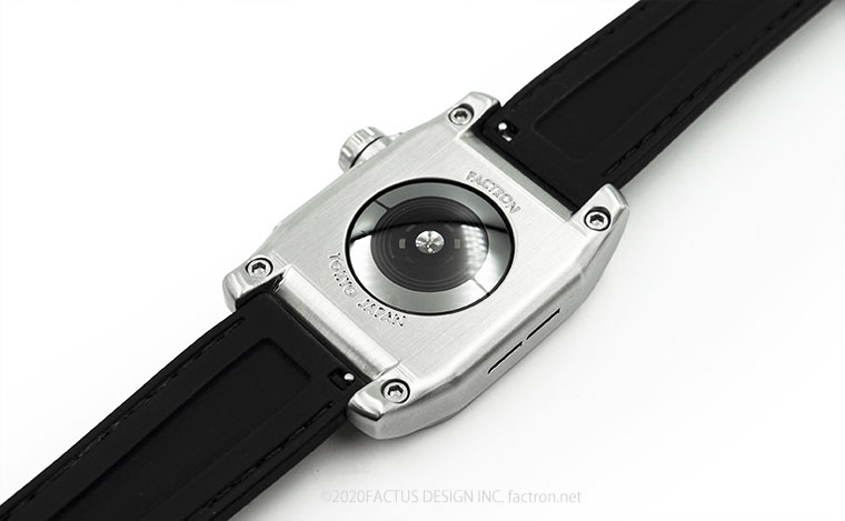 裏側は裏側ジャケットで覆い、FACTRONの刻印を彫刻 。 直接肌に触れる部分のため、柔らかくソフトな形状にモデリングしています。 緩やかなカーブをつけることで腕にフィットします。 バンドは、一般的な腕時計用のバンドが装着できるように業界標準の「バネ棒取り付け」を採用。 多種多様なウォッチバンドに交換できるようにデザインしています。