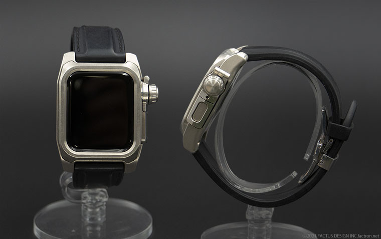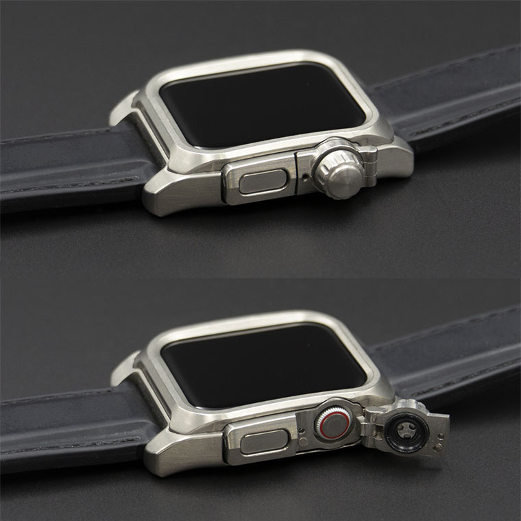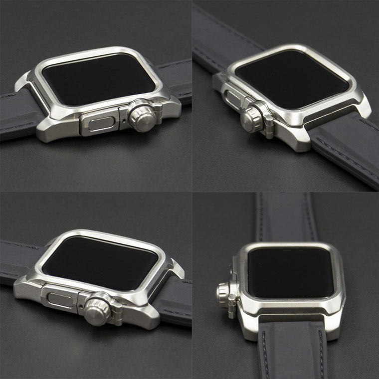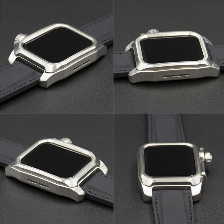 Apple Watch全体をフルカバーする構造で、一見すると全く違う個性的な腕時計になるようにデザインしました。 ベゼル内側の斜面はタッチスクリーン全体の操作性を重視しながら、ガラス表面を保護するために緩やかなカーブに合わせて一段盛り上げた形状に。