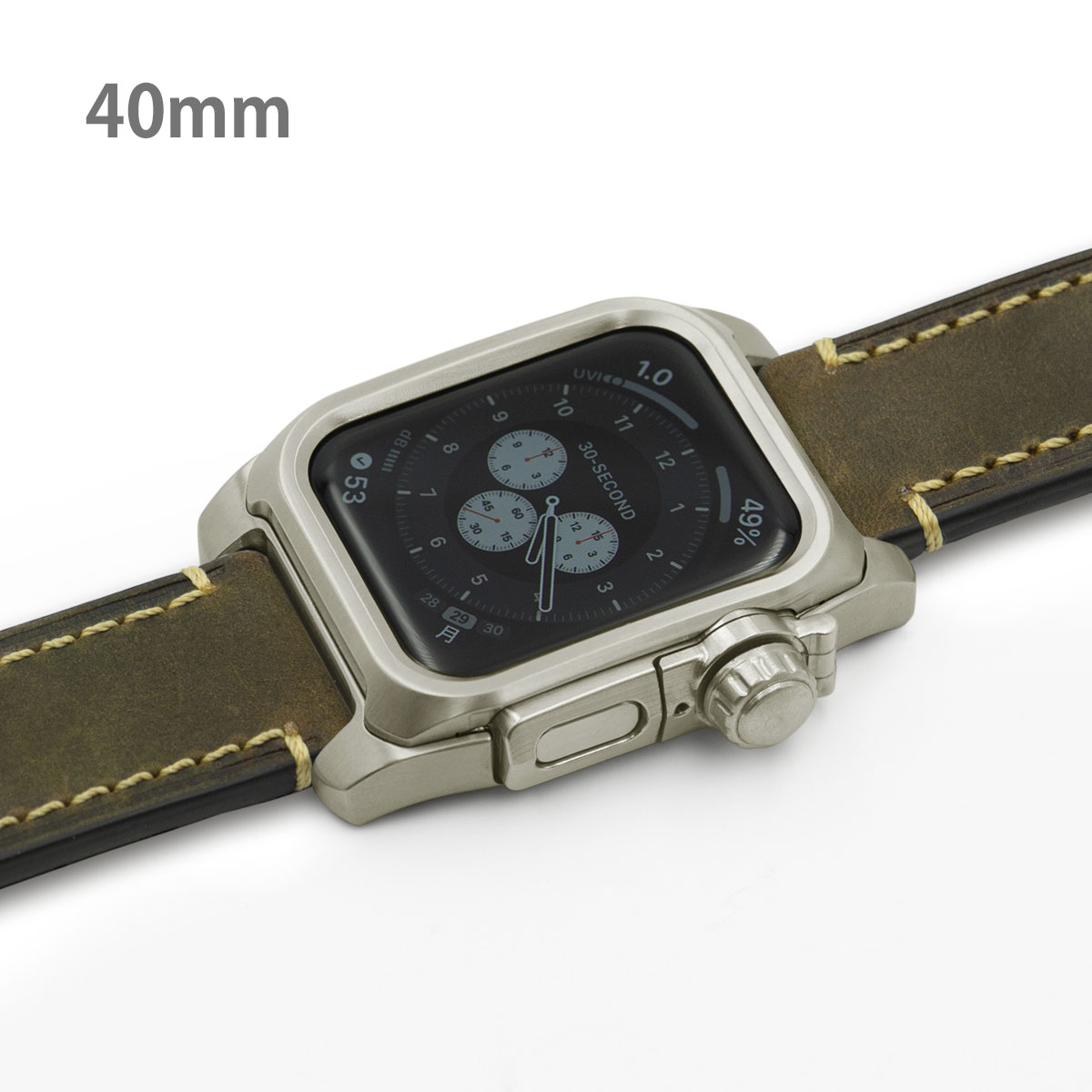 ■チタニウム削り出し エイジング処理されたつや消し(マット調)の厚手レザーバンド。 エイジング処理の関係で、バンドにキズがある場合がございます。 ・ブラウンレザーバンド ・通常バックル ・ネジ材質:ステンレススチール ・心電図App対応ボタンパーツ ※機器本体は付属しません Apple Watch SE Apple Watch Series 4 Apple Watch Series 5 Apple Watch Series 6 40mm専用モデル EDITION(セラミックモデルは非対応)