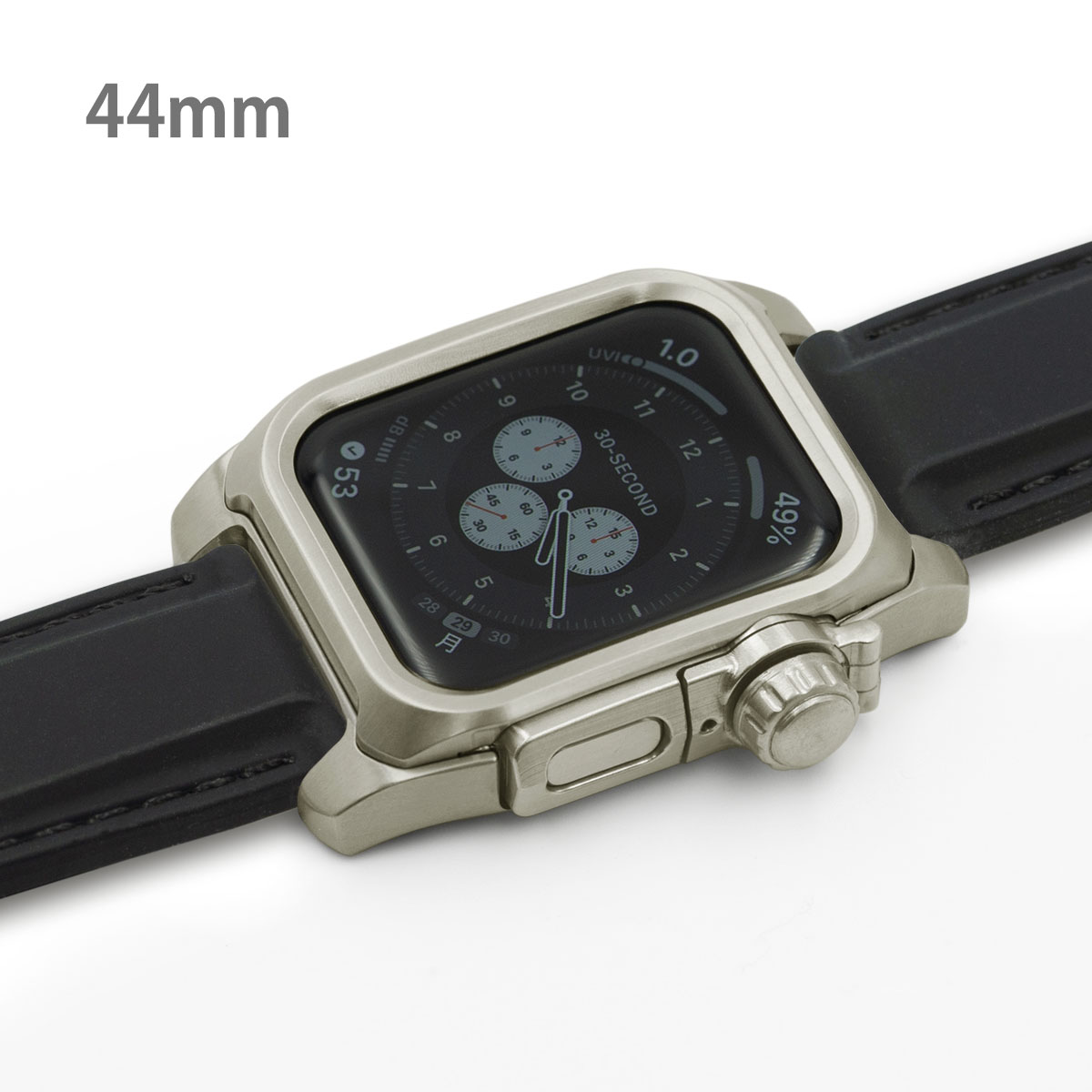 ■チタニウム削り出し ・シリコンラバーバンド ・観音開きバックル ・ネジ材質:ステンレススチール ・心電図App対応ボタンパーツ ※機器本体は付属しません Apple Watch SE Apple Watch Series 4 Apple Watch Series 5 Apple Watch Series 6 44mm専用モデル EDITION(セラミックモデルは非対応)