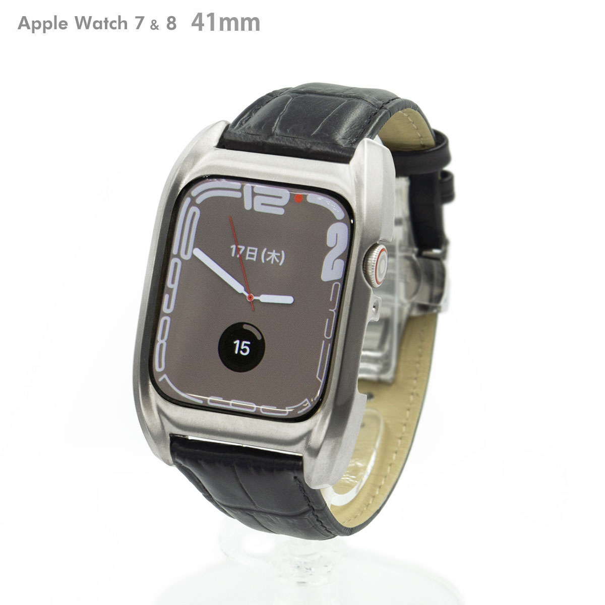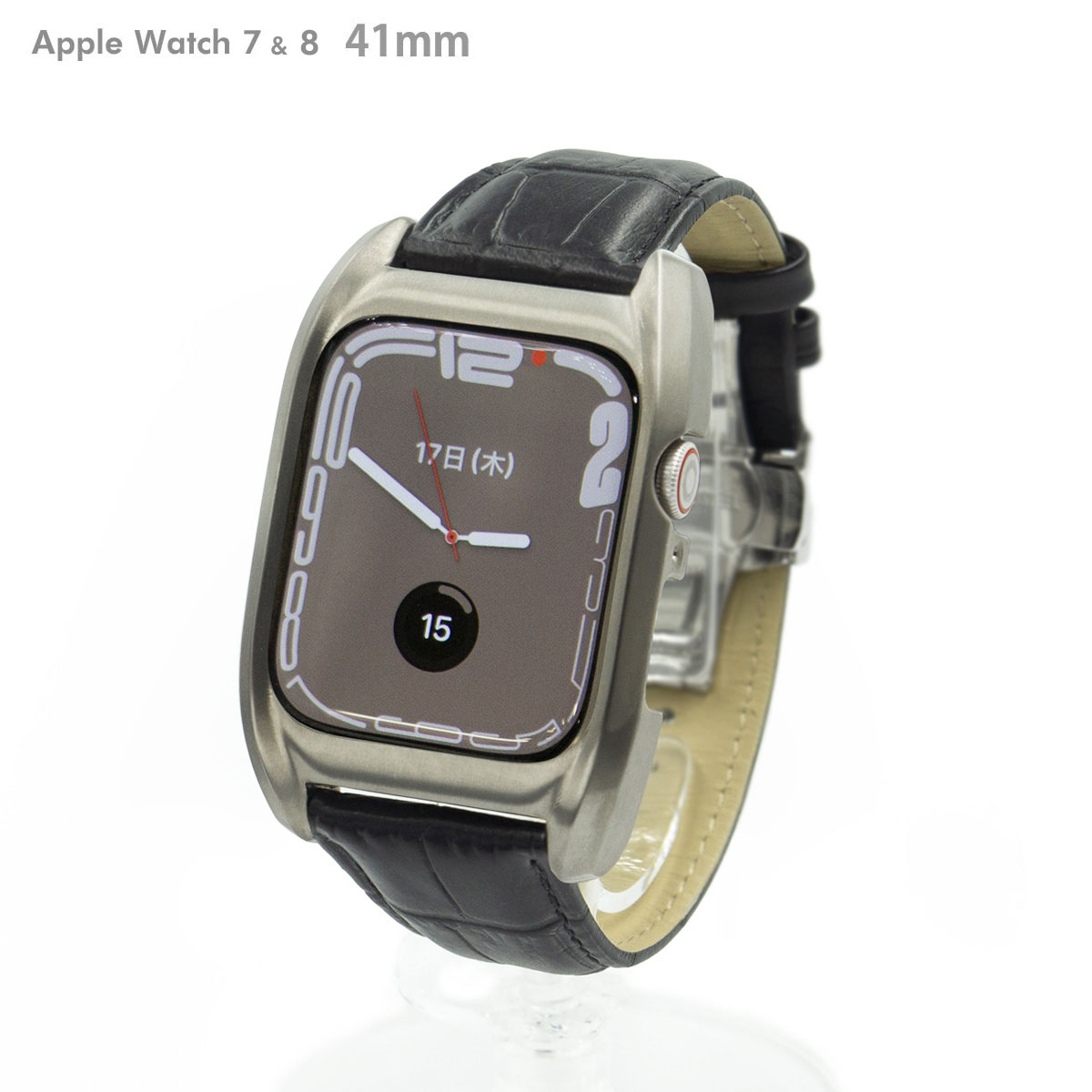 ■サージカルステンレス316L 削り出し ブラッククロコ型押し(天然牛革)ベルト ※機器本体は付属しません。 ※クロコバンドのステッチは白になる場合があります。 Apple Watch Series7&8 41mm専用 それ以外の機種はご使用できません。