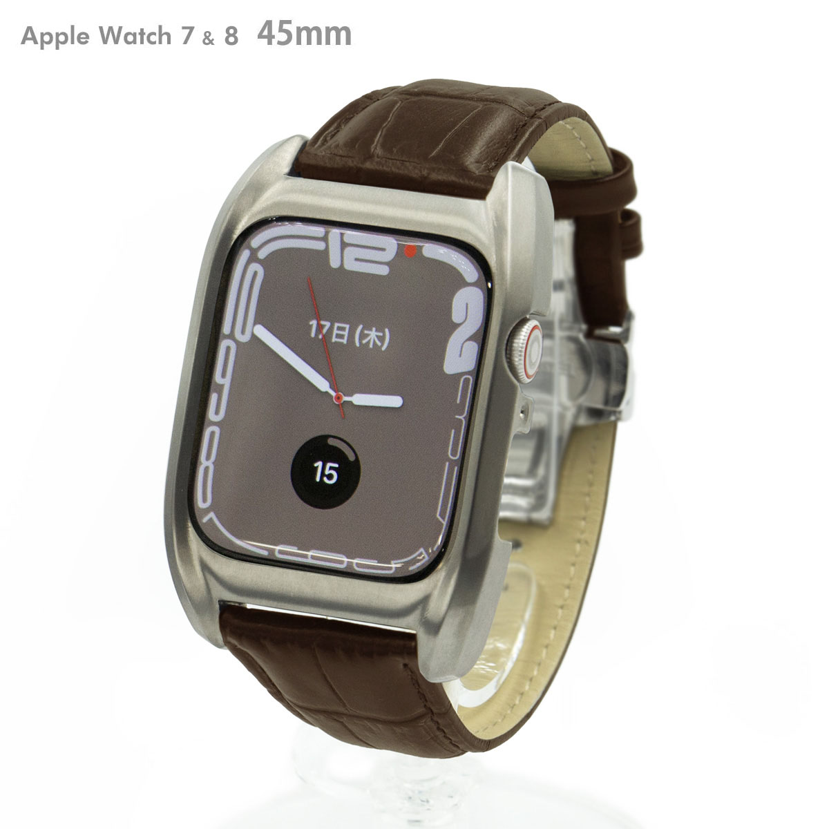 ■サージカルステンレス316L 削り出し ブラウンクロコ型押し(天然牛革)ベルト ※機器本体は付属しません。 ※クロコバンドのステッチは白になる場合があります。 Apple Watch Series7&8 45mm専用 それ以外の機種はご使用できません。