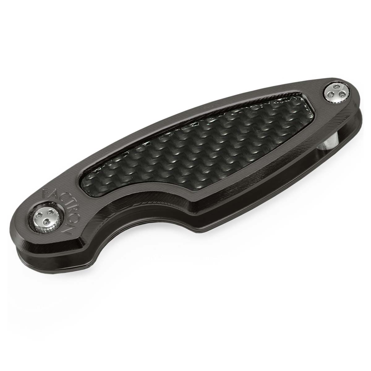ジュラルミンA2017削り出し。 ブラックのアルマイト加工。 リアルブラックカーボン貼り合わせ。 長さ:約86.5mm×幅:約29mm 厚み:約13mm(鍵を組み込まない状態で)