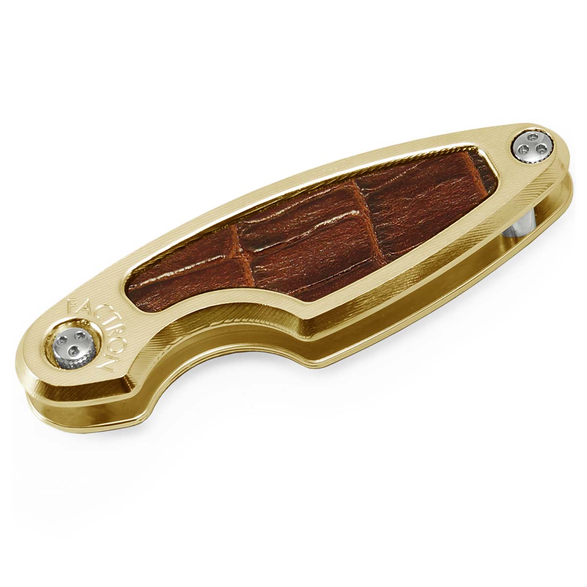 ジュラルミンA2017削り出し。 上品なシャンパンゴールドのアルマイト加工。 ブラウンのクロコ型押し高級カーフ貼り合わせ。 長さ:約86.5mm×幅:約29mm 厚み:約13mm(鍵を組み込まない状態で)