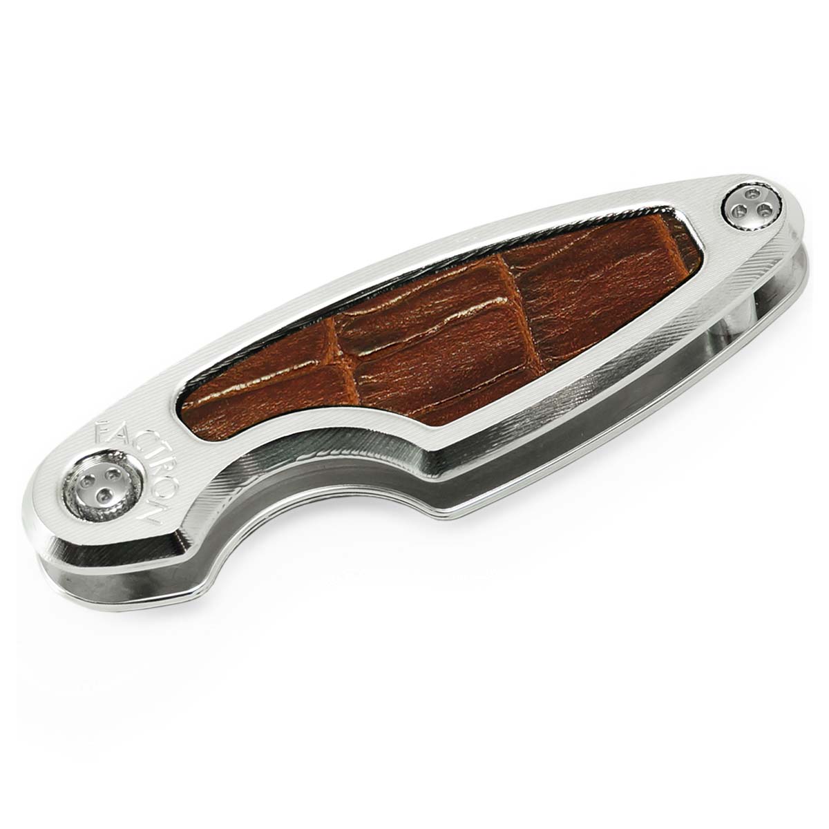 ジュラルミンA2017削り出し。 ブラウンのクロコ型押し高級カーフ貼り合わせ。 長さ:約86.5mm×幅:約29mm 厚み:約13mm(鍵を組み込まない状態で)