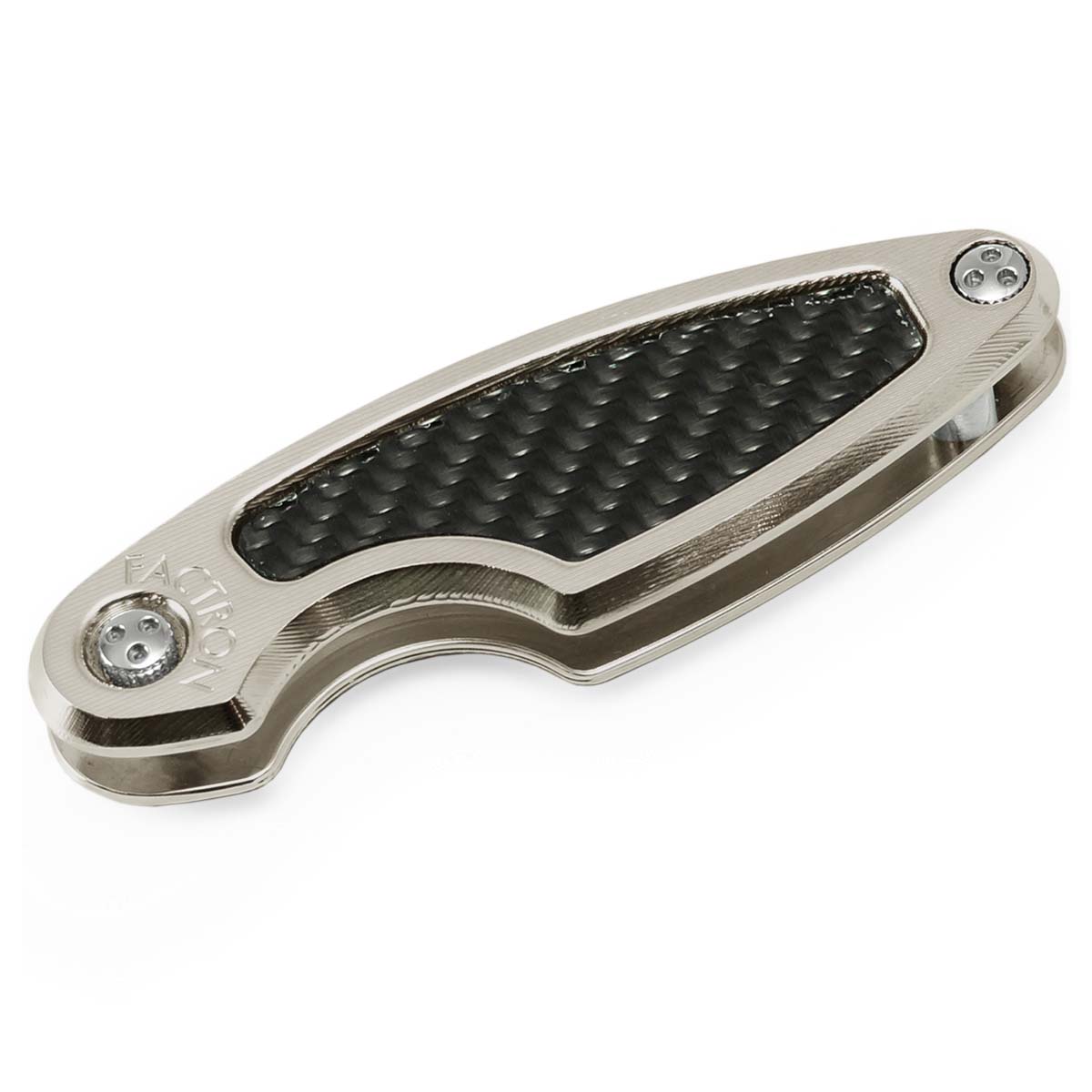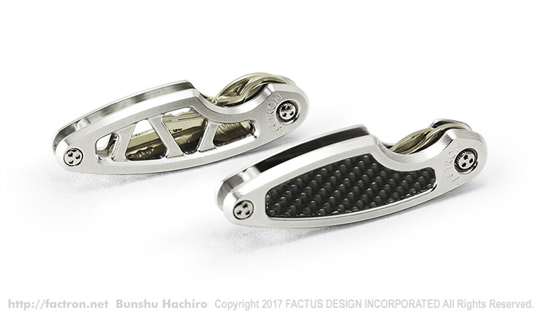 純チタニウム削り出し。 軽量でサビに強く、アレルギーも少ない素材。 リアルブラックカーボン貼り合わせ。 長さ:約86.5mm×幅:約29mm 厚み:約13mm(鍵を組み込まない状態で)