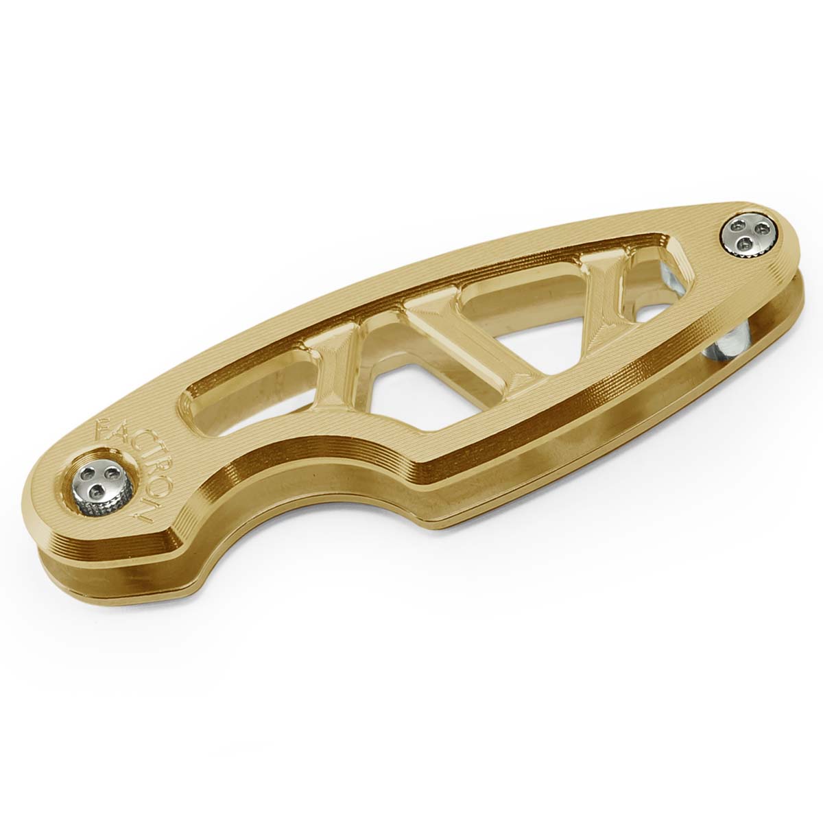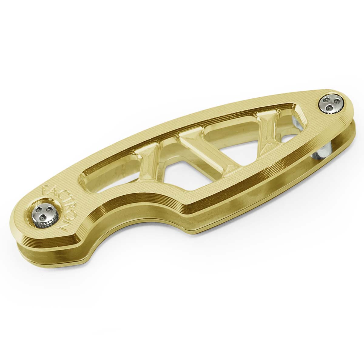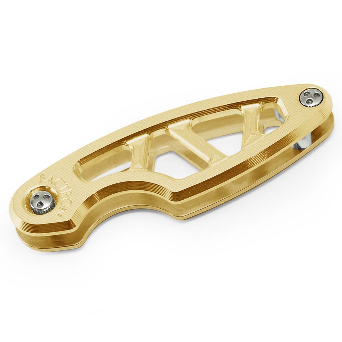 ジュラルミンA2017削り出し。 上品なシャンパンゴールドのアルマイト加工。 長さ:約86.5mm×幅:約23mm 厚み:約13mm(鍵を組み込まない状態で)