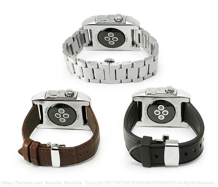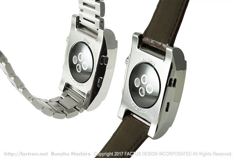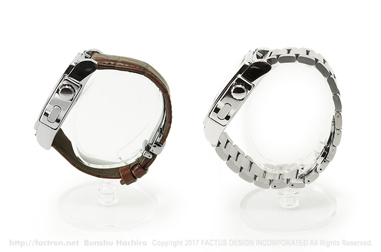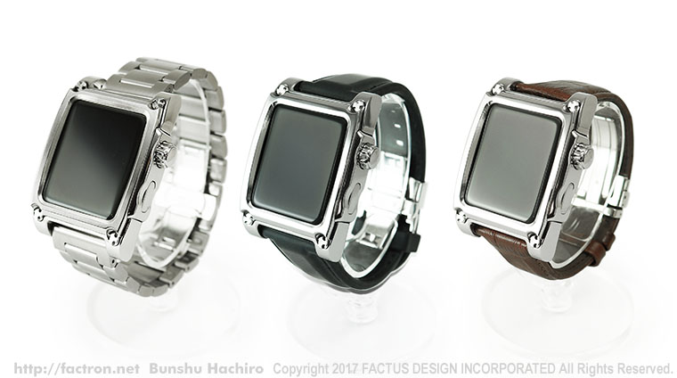 素材は、サージカルステンレススチール316L。 クロコ型押し天然牛革の高品質なレザーバンド。 水に濡れても安心なブラックの柔らかいウレタンバンド。 そして、重厚なステンレスメタルバンド。 お客様とFACTRONのデザイナーが、カラーや素材などをご相談して仕様を決める オーダーメイドプロダクトです。