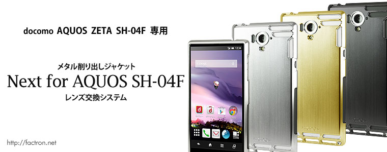 Next for AQUOS SH-04F シャープ製 docomo AQUOS ZETA SH-04F 専用ジャケット。 レンズ交換システム付き。 AQUOS のためのハイクオリティデザインです。 マジックグリップ対応。 FACTRON独自の、多彩な撮影が楽しめる「レンズ交換システム」付き。 一枚のジュラルミンの無垢材から時間をかけ 一つ一つ削り出し、手作りで仕上げるこだわりのフォルムは、 所有する価値を高めてくれます。