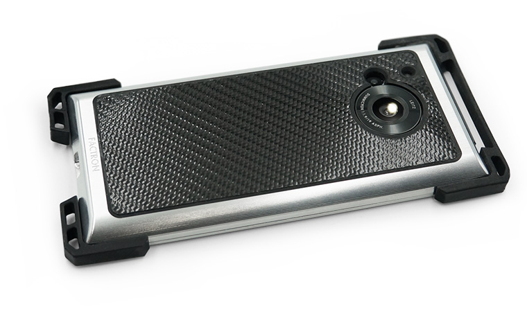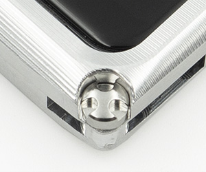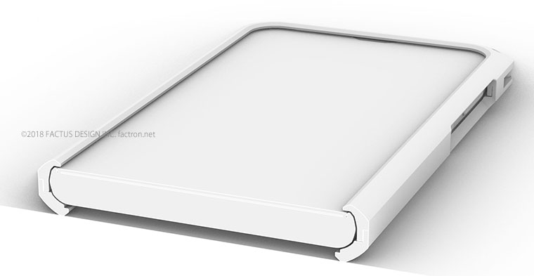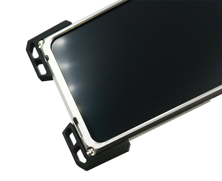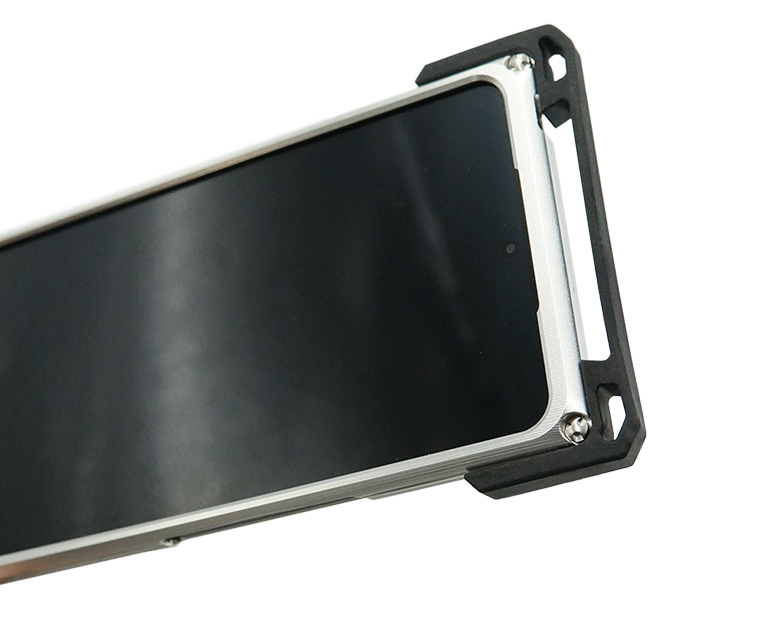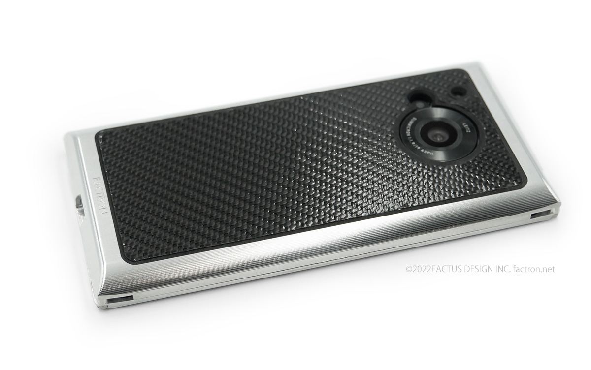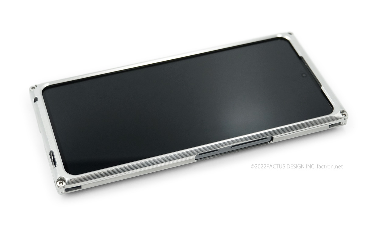 アルミの中でも最高強度のジュラルミンジャケットと機器本体が接触しない、 内部にクッション素材を貼り合わせた、FACTRON独自のフローティング構造。 本体を厚く深くはさみ込むバンパー部分が液晶面を保護します。