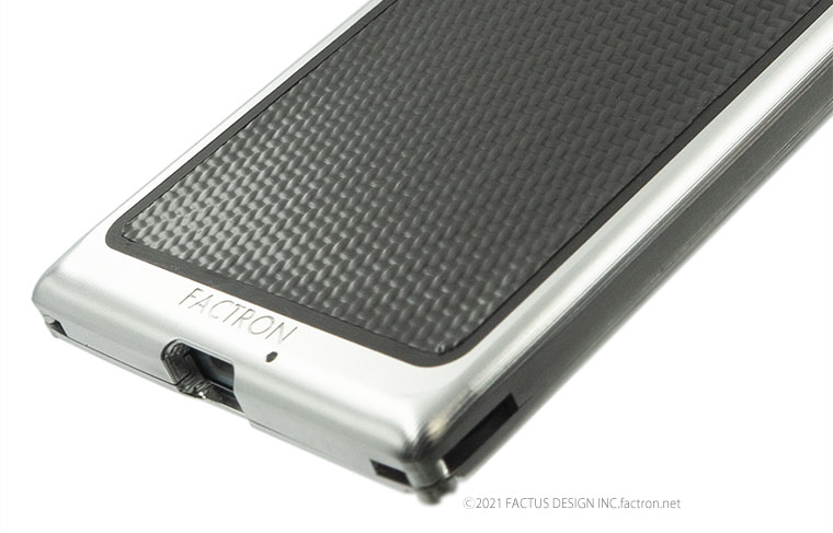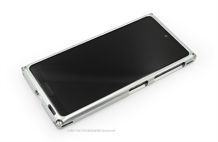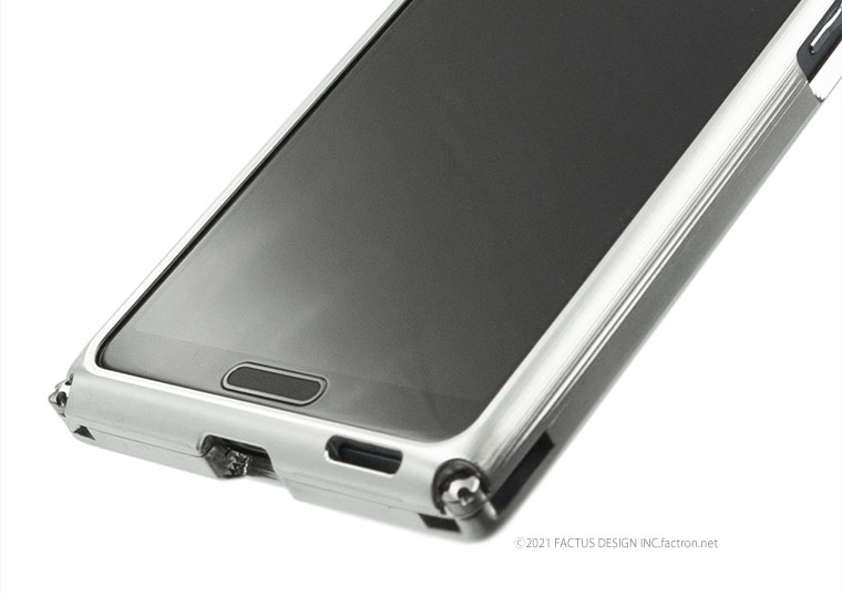 内部にはクッション素材を貼り合わせ、ジュラルミンジャケット内部に機器本体が接触しないFACTRON独自のフローティング構造。 本体を厚く深くはさみ込むバンパー部分が液晶面を保護します。