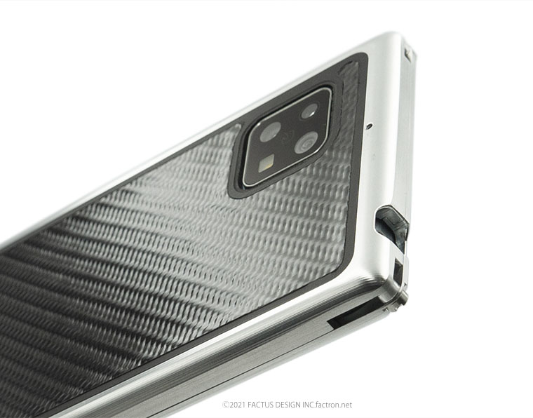 緻密な削り出し加工の滑らかな手触り。 4か所のストラップホール。 ※SIMカードやマイクロSDカードの取り出し時にはジャケットを外してください。