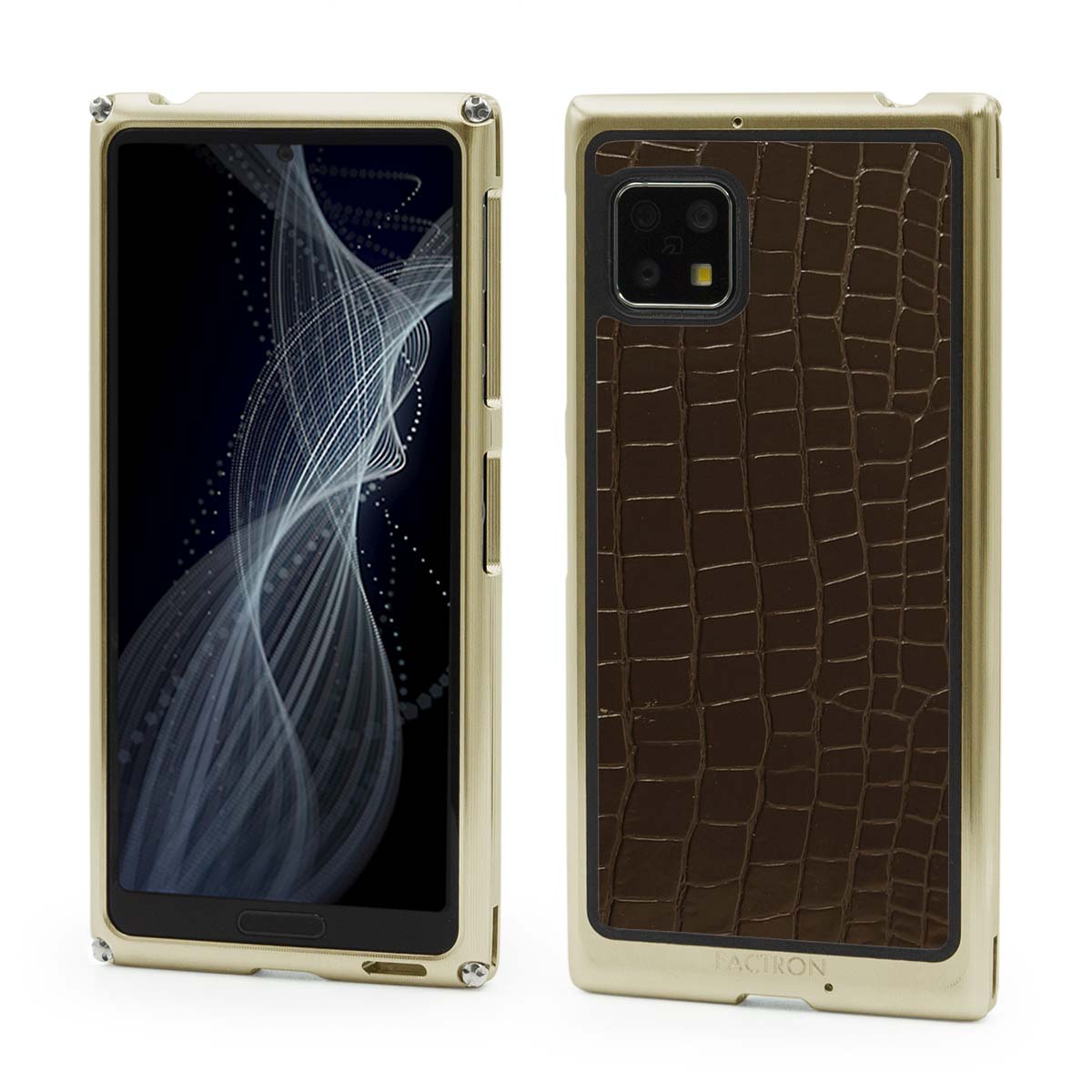 キズやサビに強くなる上品なシャンパンゴールドのアルマイト加工(表面処理)を施しました。 上品なツヤのダークブラウンクロコ型押し(天然牛革)のバックパネル。