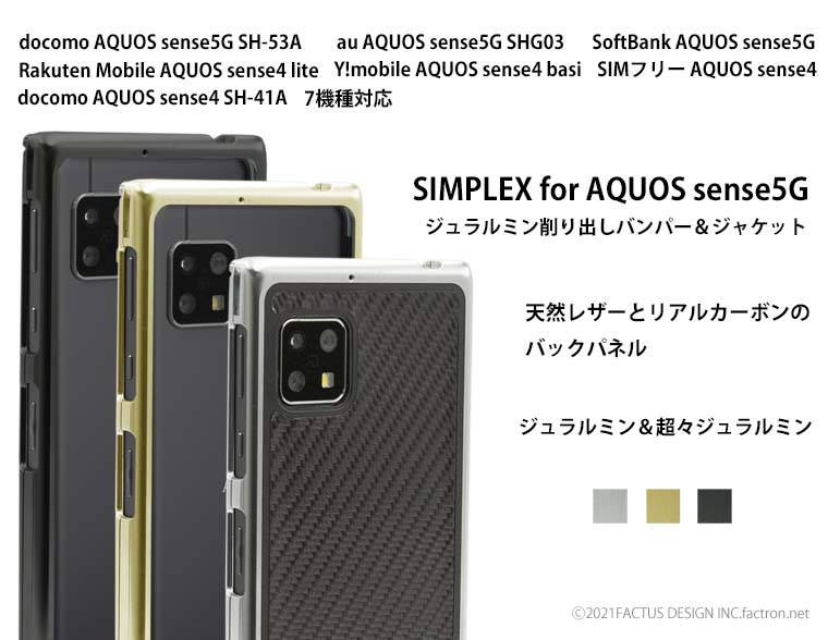 SIMPLEX for AQUOS sense5G docomo AQUOS sense5G SH-53A au AQUOS sense5G SHG03 SoftBank AQUOS sense5G SIMフリー AQUOS sense4 Y!mobile AQUOS sense4 basic docomo AQUOS sense4 SH-41A Rakuten Mobile AQUOS sense4 lite 7機種対応のジュラルミン削り出しバンパー&ジャケット。 AQUOS のためのハイクオリティデザインです。 一枚のジュラルミンの無垢材から時間をかけ 一つ一つ削り出し、手作りで仕上げるこだわりのフォルムは、 所有する価値を高めてくれます。