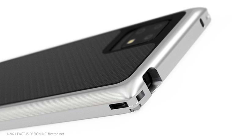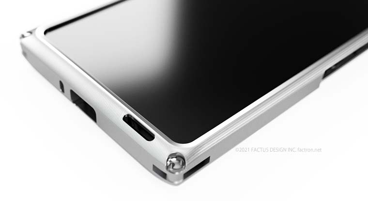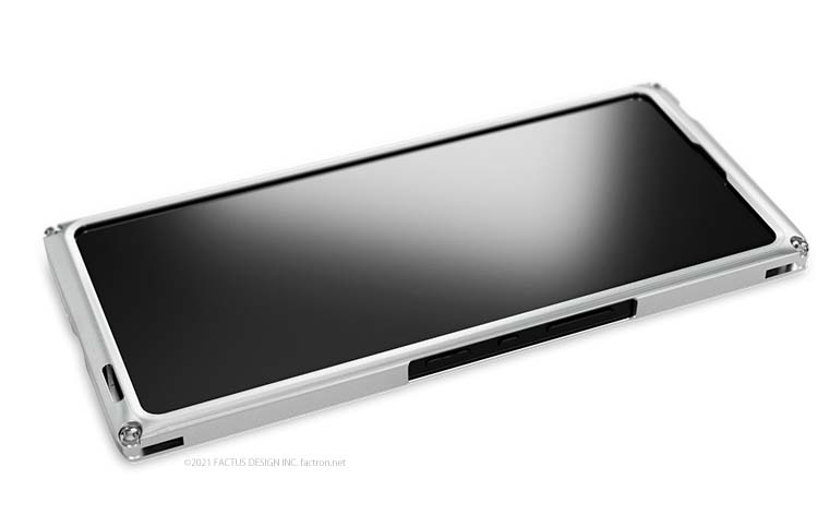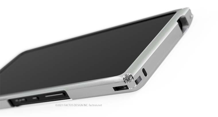 内部にはクッション素材を貼り合わせ、ジュラルミンジャケット内部に機器本体が接触しないFACTRON独自のフローティング構造。 本体を厚く深くはさみ込むバンパー部分が液晶面を保護します。