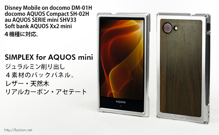 SIMPLEX for AQUOS mini シャープ製 Disney Mobile on docomo DM-01H docomo AQUOS Compact SH-02H au AQUOS SERIE mini SHV33 Soft bank AQUOS Xx2 mini 4機種対応のバックパネル式ジャケット。 AQUOS のためのハイクオリティデザインです。 全ての機能に対応。 ジャケットのみでも、バックパネル付きでも両方でお使いいただけます。 一枚のジュラルミンの無垢材から時間をかけ 一つ一つ削り出し、手作りで仕上げるこだわりのフォルムは、 所有する価値を高めてくれます。