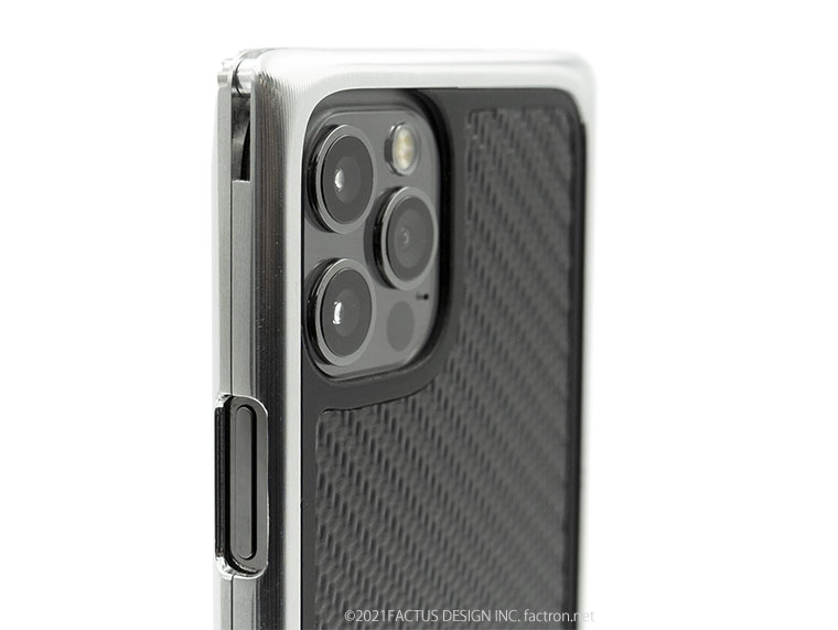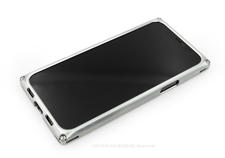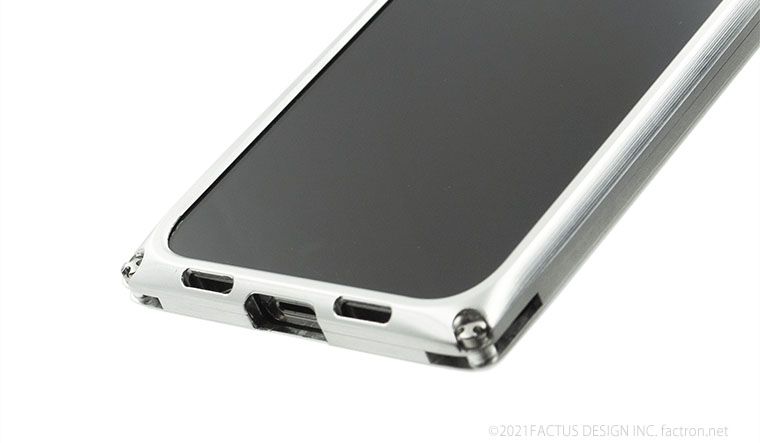 内部にはクッション素材を貼り合わせ、ジュラルミンジャケット内部に機器本体が接触しないFACTRON独自のフローティング構造。 本体を厚く深くはさみ込むバンパー部分が液晶面を保護します。