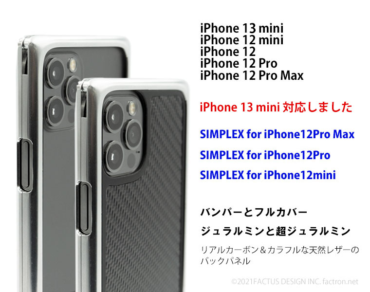 SIMPLEX for iPhone12mini SIMPLEX for iPhone12Pro SIMPLEX for iPhone12Pro Max iPhone 13 mini、iPhone 12 mini、iPhone 12、iPhone 12Pro と iPhone 12Pro Max専用 ジュラルミン削り出しジャケット シンプルな中にも自己主張するデザイン。 一枚のジュラルミンの無垢材から時間をかけ 一つ一つ削り出し、手作りで仕上げるこだわりのフォルムは、 所有する価値を高めてくれます。 ※iPhone 12 mini用 は iPhone 13 mini でご使用いただけます