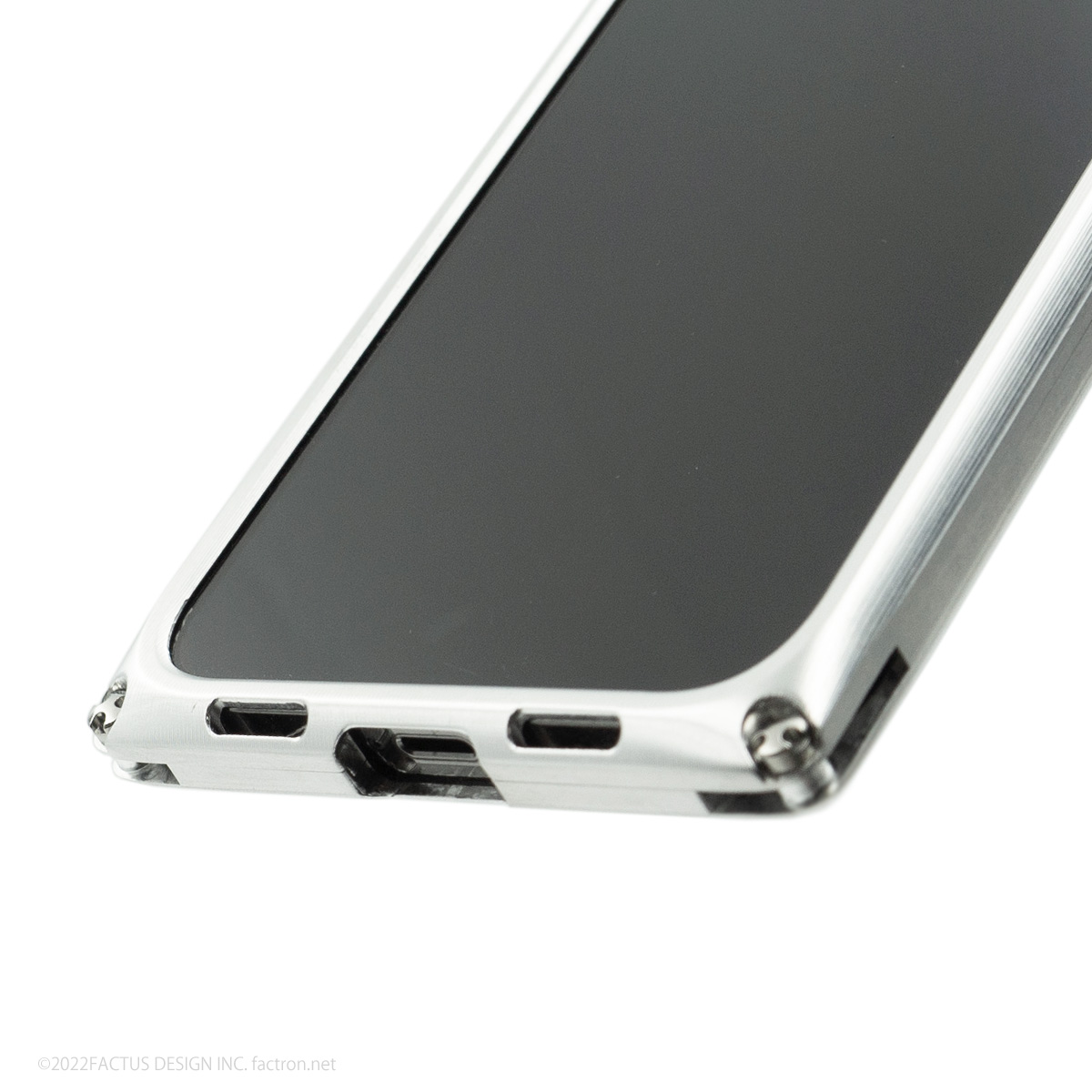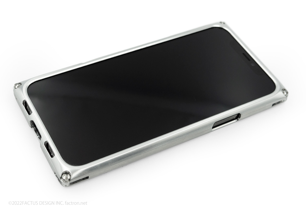 内部にはクッション素材を貼り合わせ、ジュラルミンジャケット内部に機器本体が接触しないFACTRON独自のフローティング構造。 本体を厚く深くはさみ込むバンパー部分が液晶面を保護します。