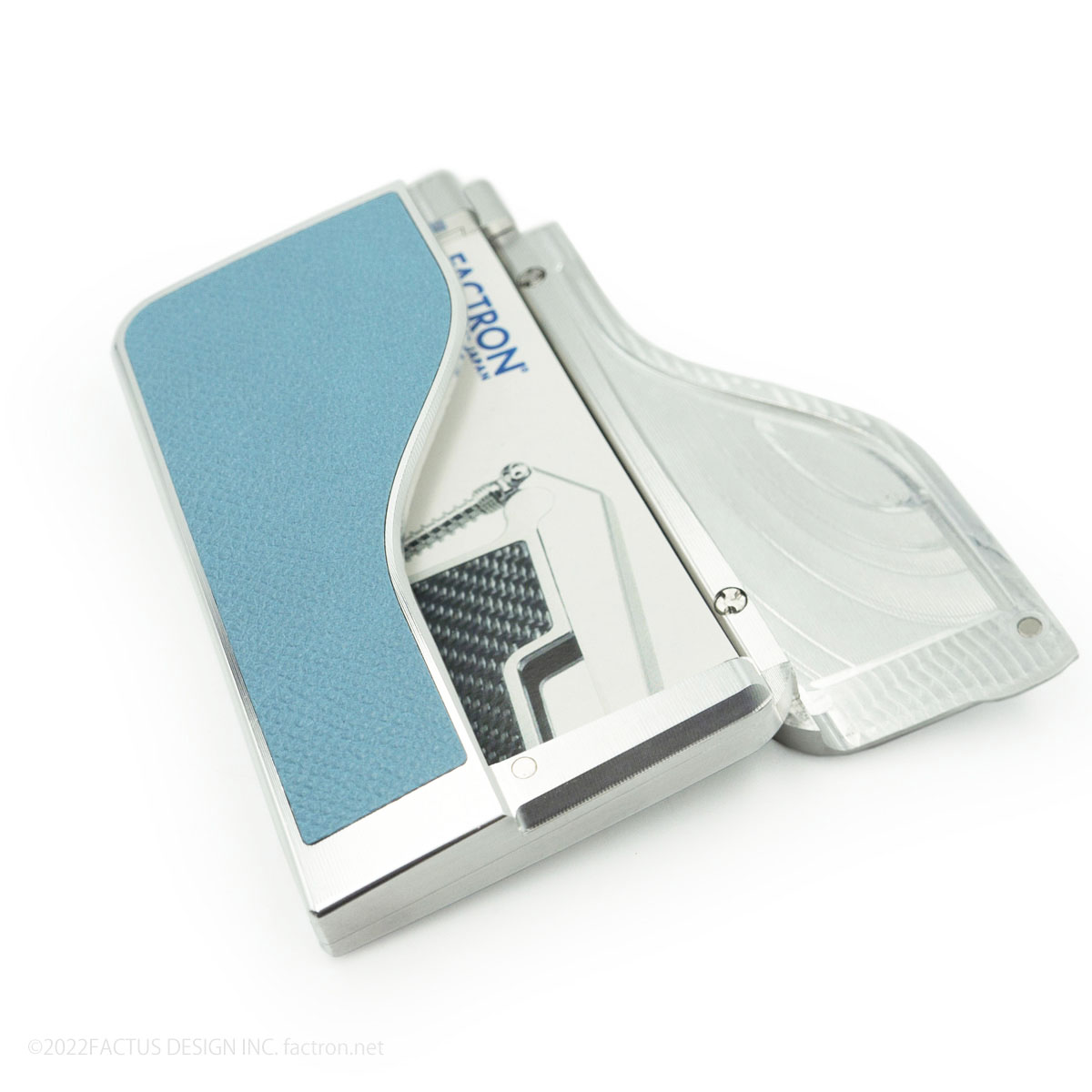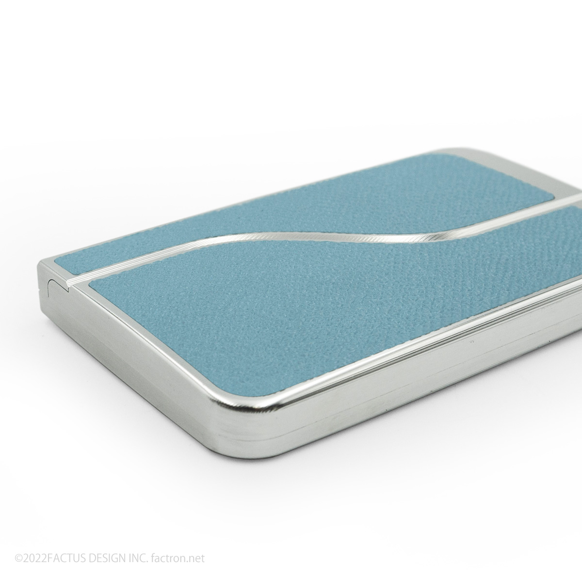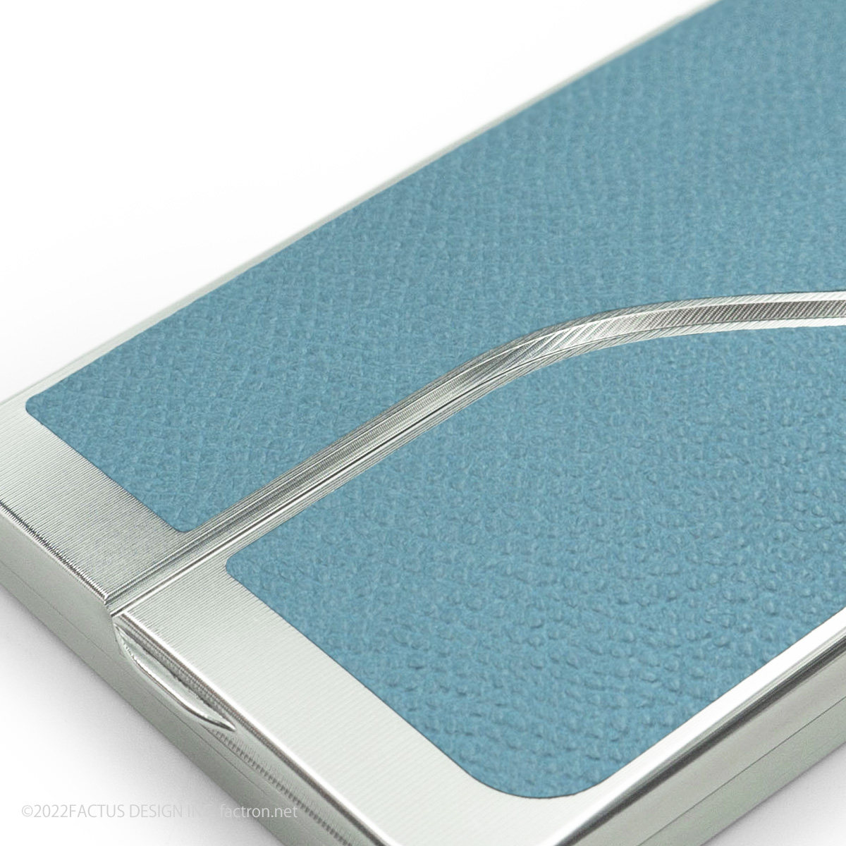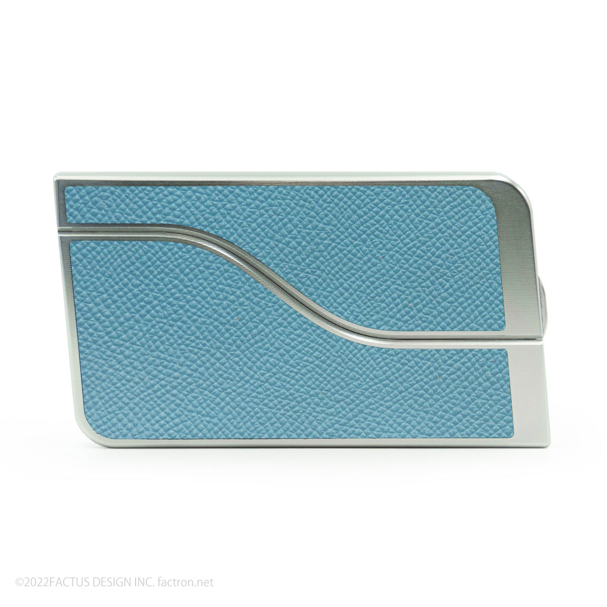 ジュラルミンの輝きを大切に手仕上げで磨き上げました。 お手入れで何度でも輝きが戻るジュラルミン素地。 鮮やかなライトブルーの高級シュリンクレザー(牛革)とのコンビネーション。 素材:ジュラルミンA2017、牛革