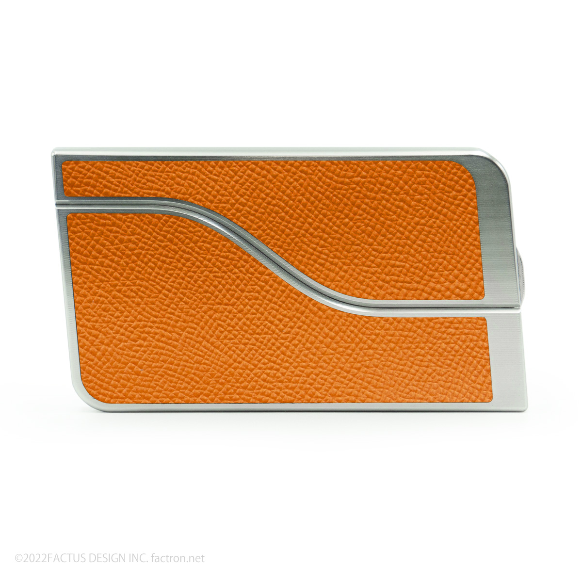 ジュラルミンの輝きを大切に手仕上げで磨き上げました。 お手入れで何度でも輝きが戻るジュラルミン素地。 鮮やかなタンジェリン(オレンジ)カラーの高級シュリンクレザー(牛革)とのコンビネーション。 素材:ジュラルミンA2017、牛革