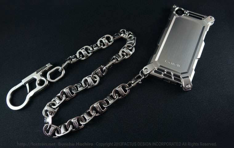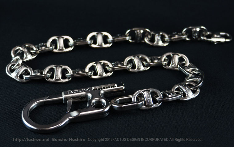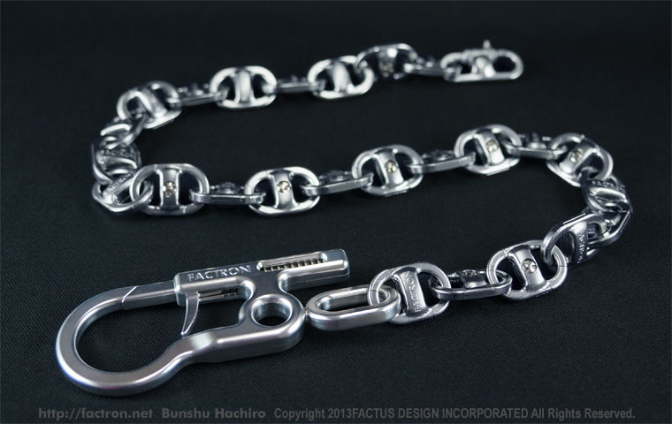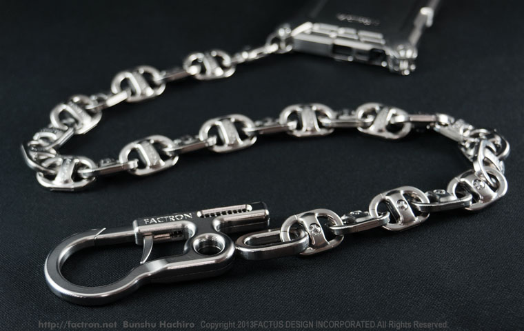 インダストリアルデザイナーでプロダクトクリエーターであるハチロブンシュウが、自ら工作機械を操り完成させた逸品です。 今ここに、緻密に計算された最上のデザインで、最上の堅牢さ、最上の完成度のウォレットチェーンを創り出しました。