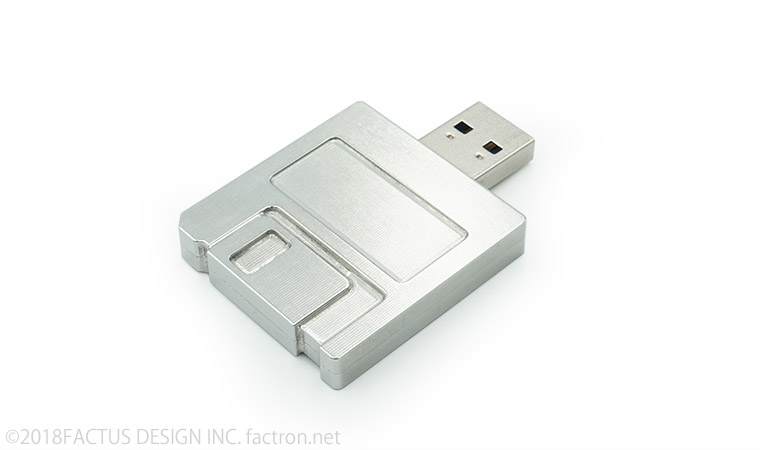 フロッピーディスクがモチーフのUSBメモリー。 ジュラルミンA2017削り出し。 丁寧にハンドポリッシュで磨き上げました。