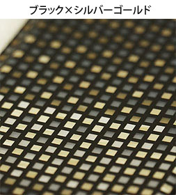 ブラックの枠にゴールド・シルバー・ダークグレー・ライトグレーの小さなタイルをはめ込んだような模様。光の加減でゴールドとシルバーが控えめに輝きます。