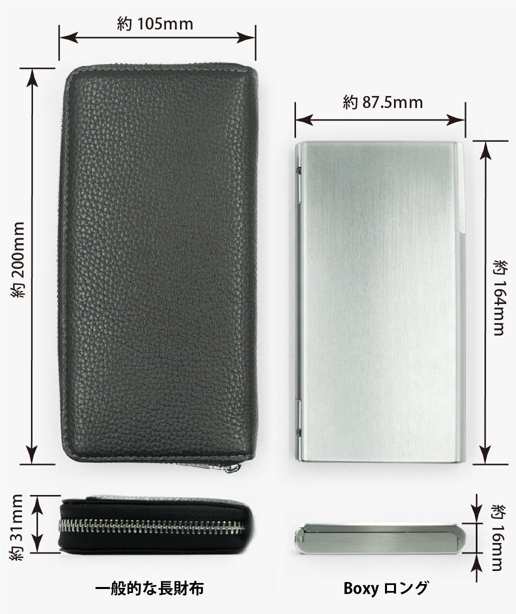 二つ折りタイプの『メタルウォレット Boxy』の長財布バージョン。