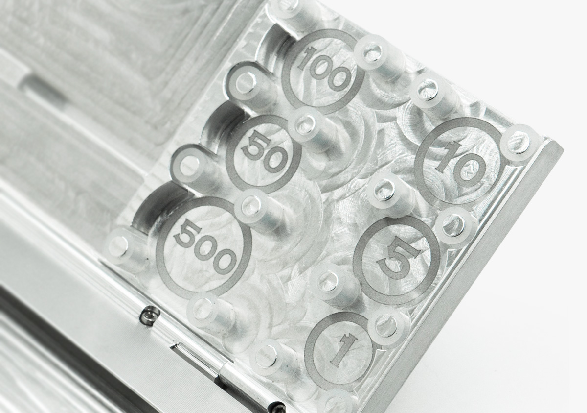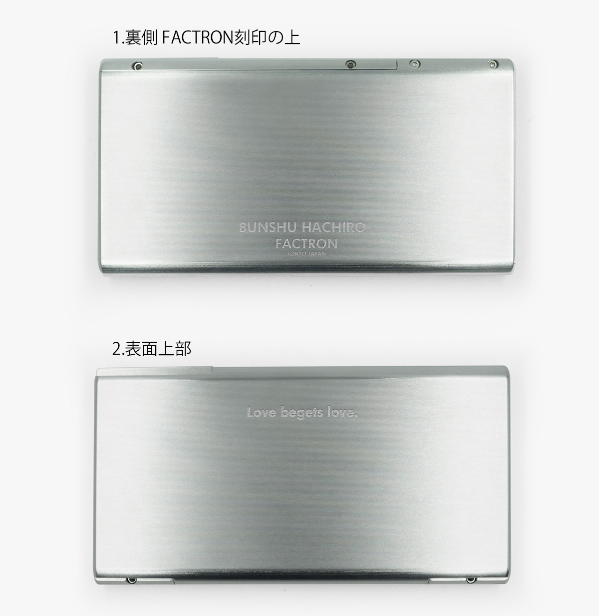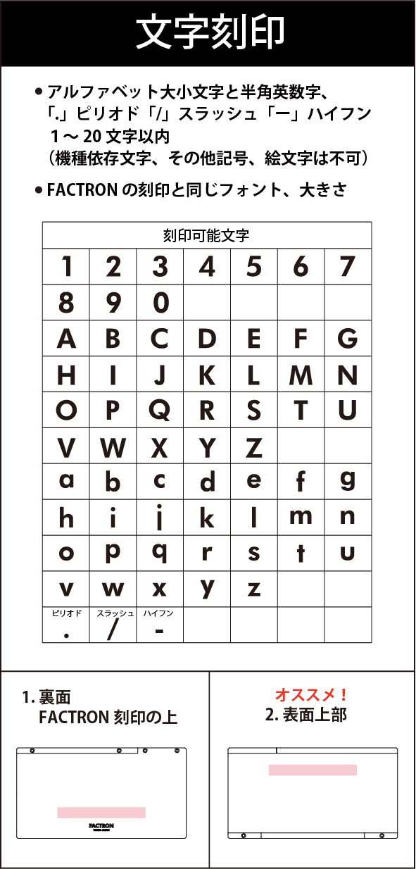 この公式ページのみのオプションサービス。 ジュラルミンモデル・チタンモデル共に文字刻印が可能です。 ご希望の場合は「カートに入れる」のプルダウンからお選び下さい。 お名前やイニシャル、好きな言葉など、あなただけの刻印をどうぞ。 刻印位置は、シェルを開く際にカード類がこぼれ落ちない方向の目印となる、「2.表面」がおすすめです。 FACTRON刻印と同じフォント・大きさ、20文字以内。