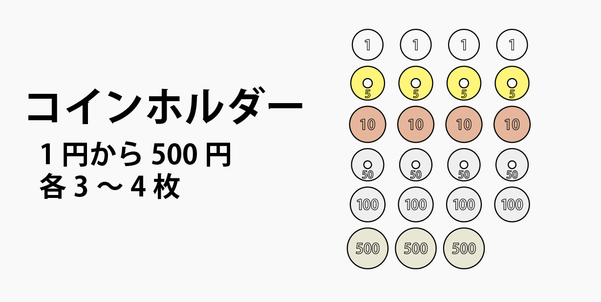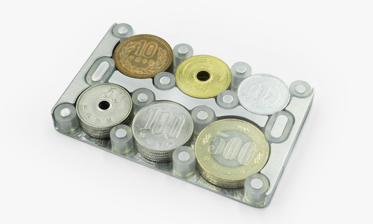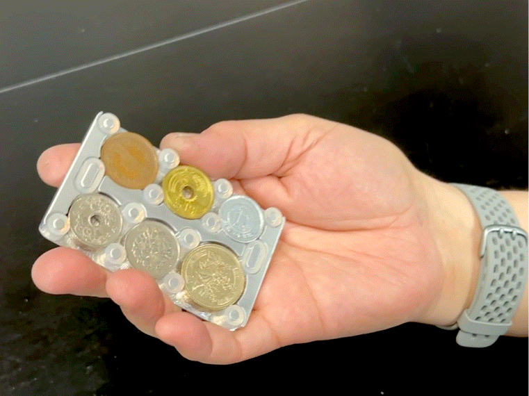 6か所にコインをはめ込み、一目で残量がわかります。 コインを一枚ずつホールドするので、コイン同士がぶつかるジャラジャラ音が発生しにくい構造。