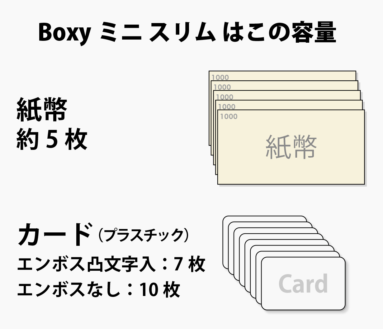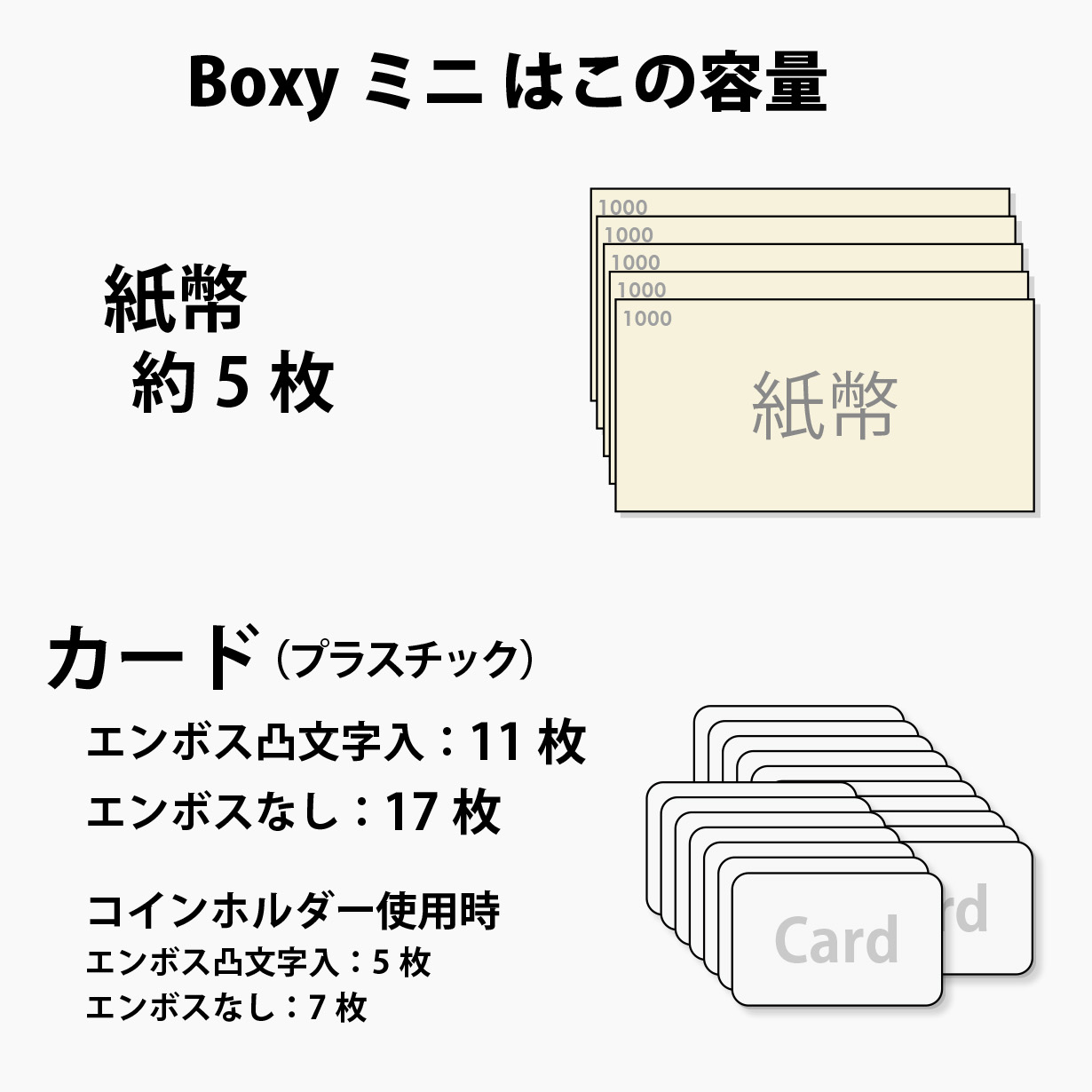 Boxyミニにコインホルダーを入れた場合、カードの上限枚数は5〜7枚 Boxyミニスリムにコインホルダーを入れた場合、カードの上限枚数は1枚です。