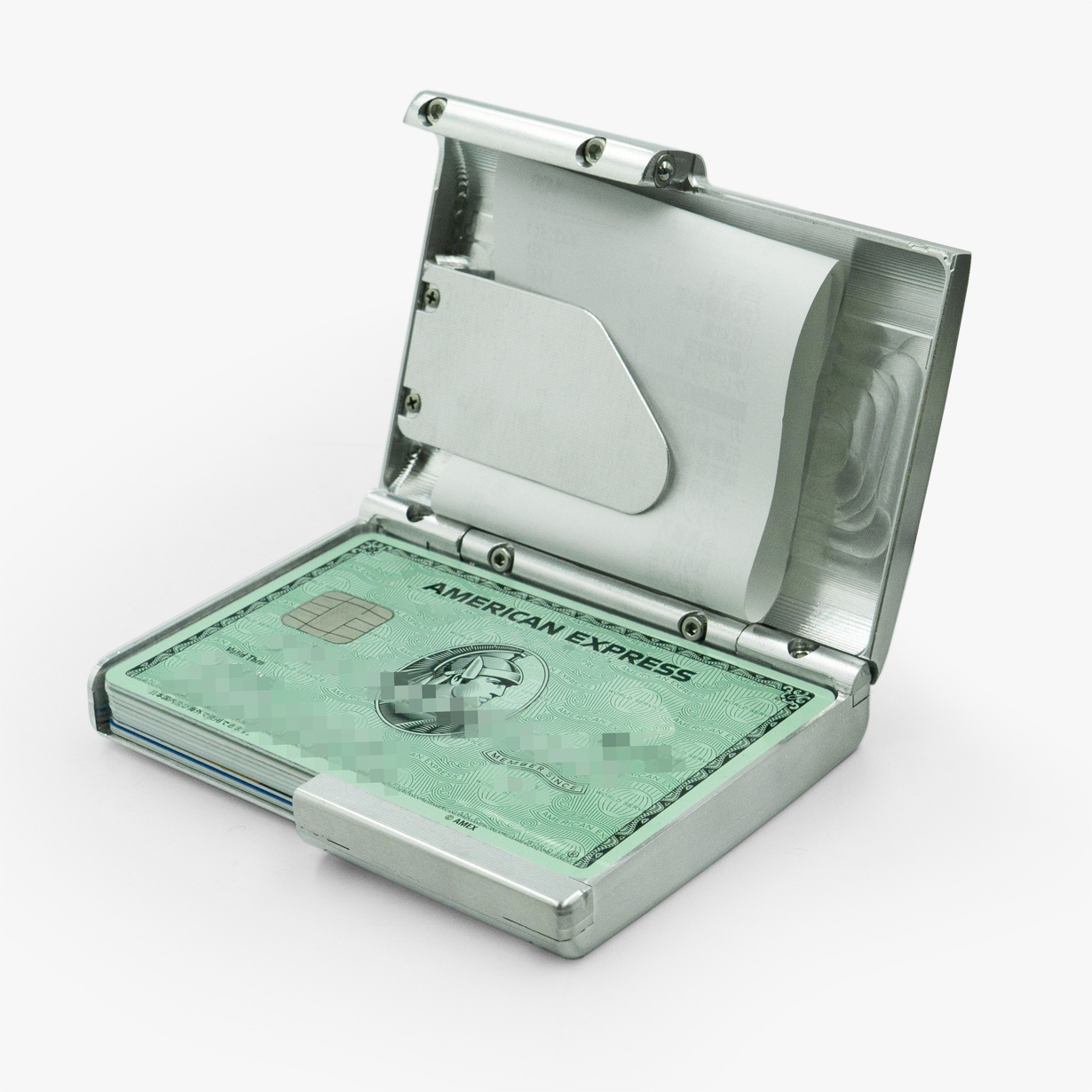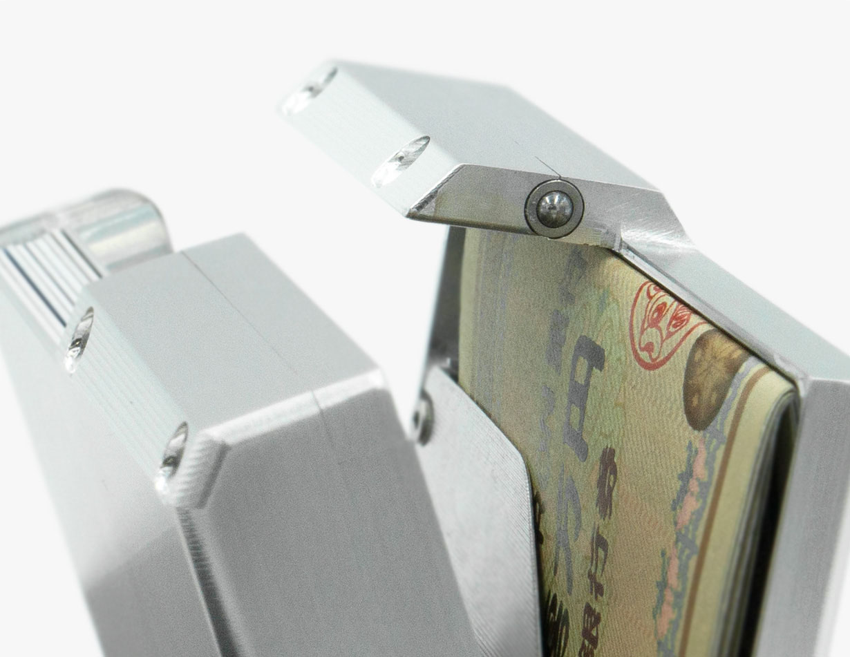 カード類はジュラルミン(アルミ合金)製のシェル(外殻)の中に完全に収納されるため、スキミング防止機能に優れています。 閉じた状態で全方向からカード類を守ります。