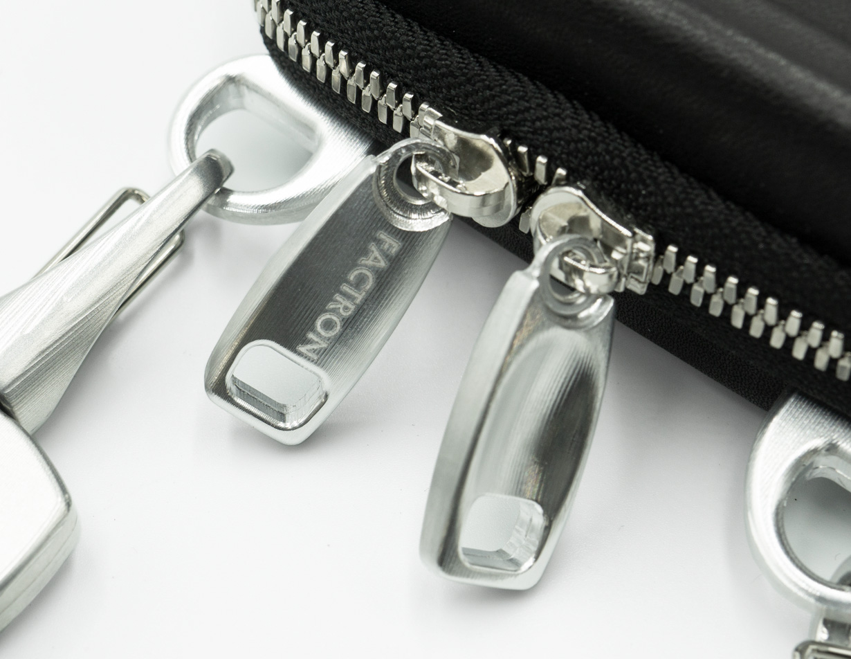 金具類は、FACTRONオリジナルデザインで製造します。 航空機にも使われる、軽量で強靭な「ジュラルミン」と さらに強靭なレアメタル「チタン」の2種。 ひとつひとつ機械で削り出し、丁寧にハンドメイドで仕上げました。 市販されていない、FACTRONの完全オリジナルパーツです。