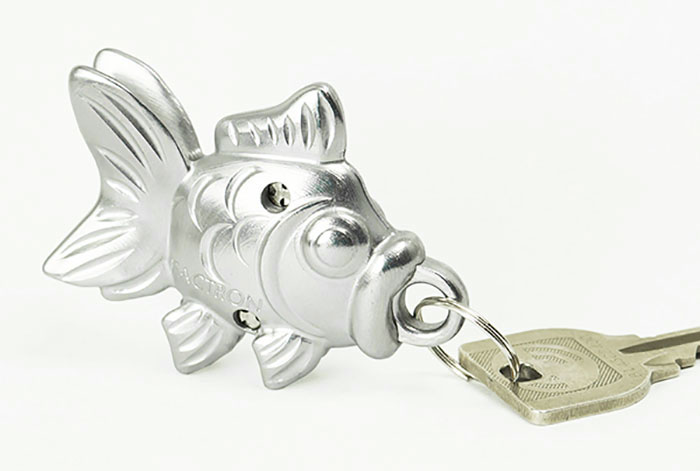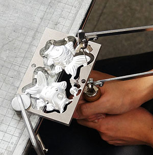 航空機にも使われる素材、ジュラルミンを削り出した材料から、立体的なキーチャームの金魚を作ります。 いと鋸で切り離し、やすりで削り、紙やすりでなめらかに仕上げ、ハンドポリッシュで磨き上げる工程。 自分だけの金魚チャームをお作りいただけます。 完成品は通常のショップ価格13,000円の製品です。