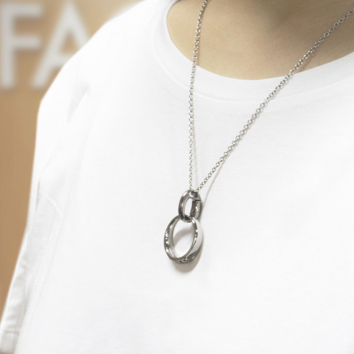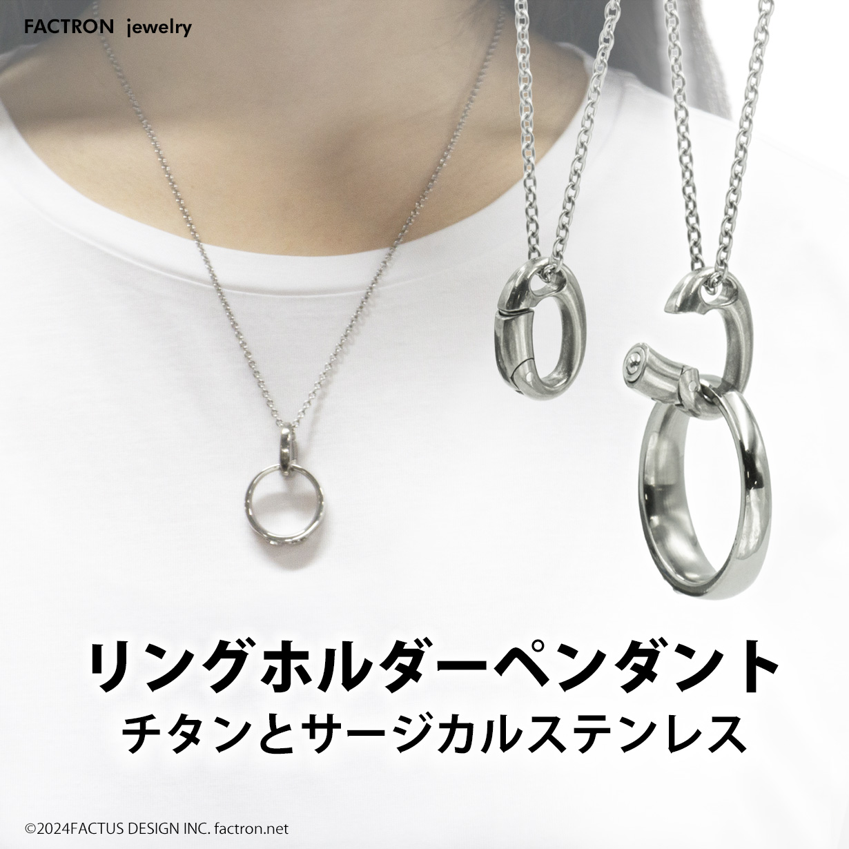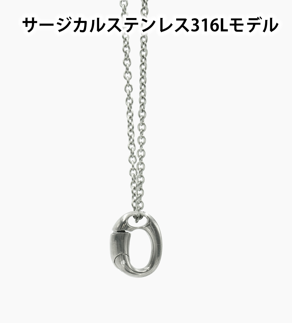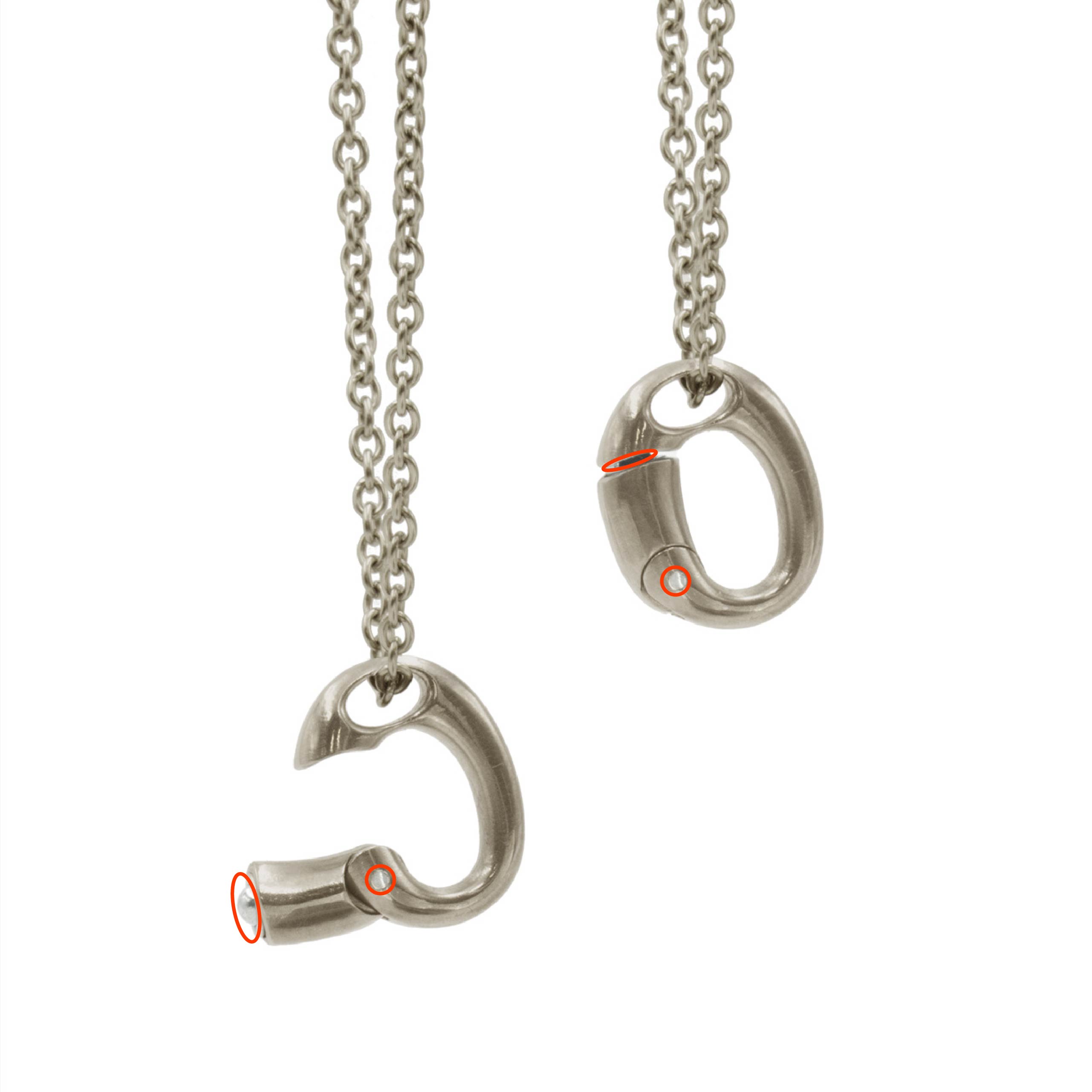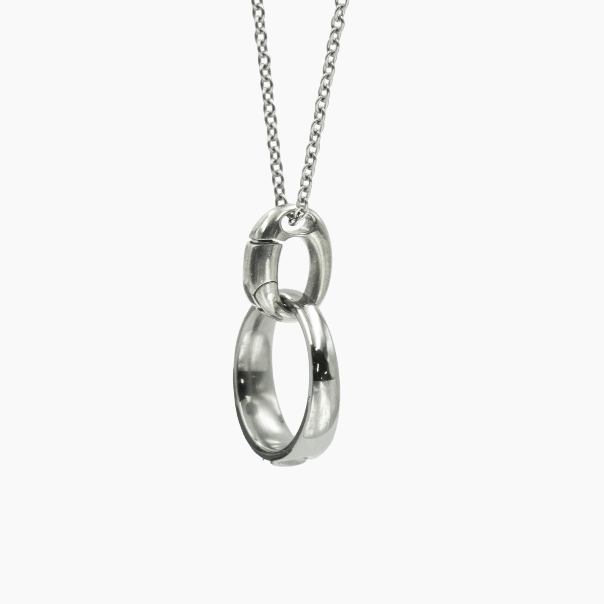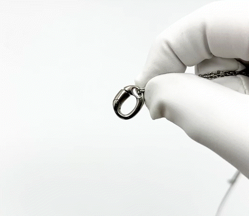 リングの付け外しで首からチェーンを外さなくてOK。 首にかけたままで手軽にカチッとリングを着脱。 付けるのも外すのもワンタッチで、しっかりとリングをホールドします。