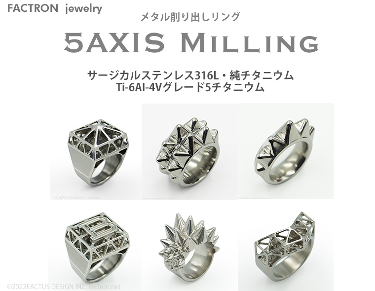 どこにもない新しい存在感のFACTRON Jewelry 5AXIS Millingシリーズ 繊細でゴージャスなインダストリアルジュエリーの新境地です サージカルステンレス、純チタニウム、そしてあの高強度な64チタン デザイナーの思いをそのままに デザイナー自ら5軸加工機を操り、つくりあげます 全て削り出し 全てオリジナルデザイン 6つのデザインからお選びください 新型2点追加しました