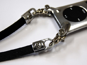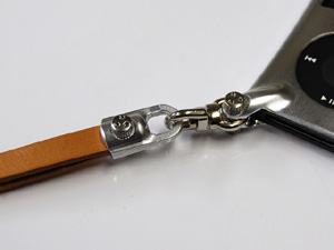 Quattroシリーズと同じジュラルミンの削り出しによる加工のパーツをオリジナルのネジでレザーバンドを挟み込みました。