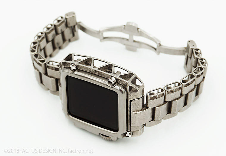 ケースの素材は、医療分野でも使用する、金属アレルギーになりにくい純チタニウム。 軽く強靭で、肌に優しい素材です。 重厚なデザインながら非常に軽量。軽やかな着け心地です。 3Dメタルプリントで作られたケースとメタルバンドは、なめらかに腕になじみます。 ネジとバックルは錆びにくく、強度のあるステンレススチール製。