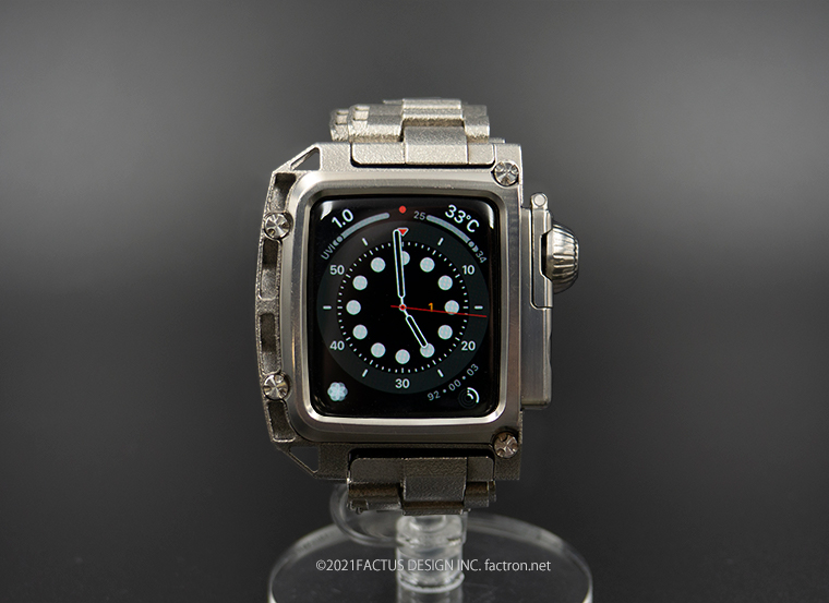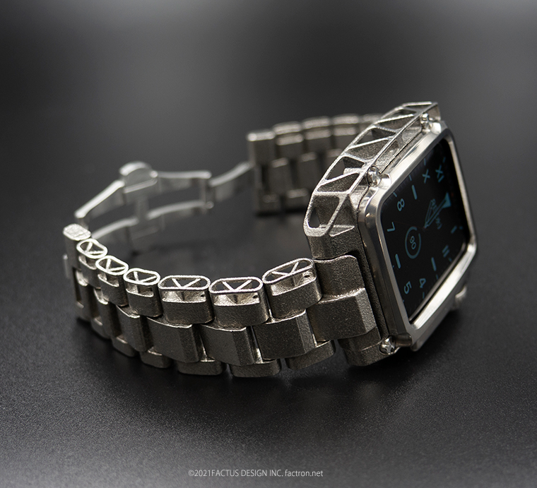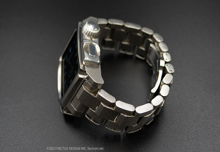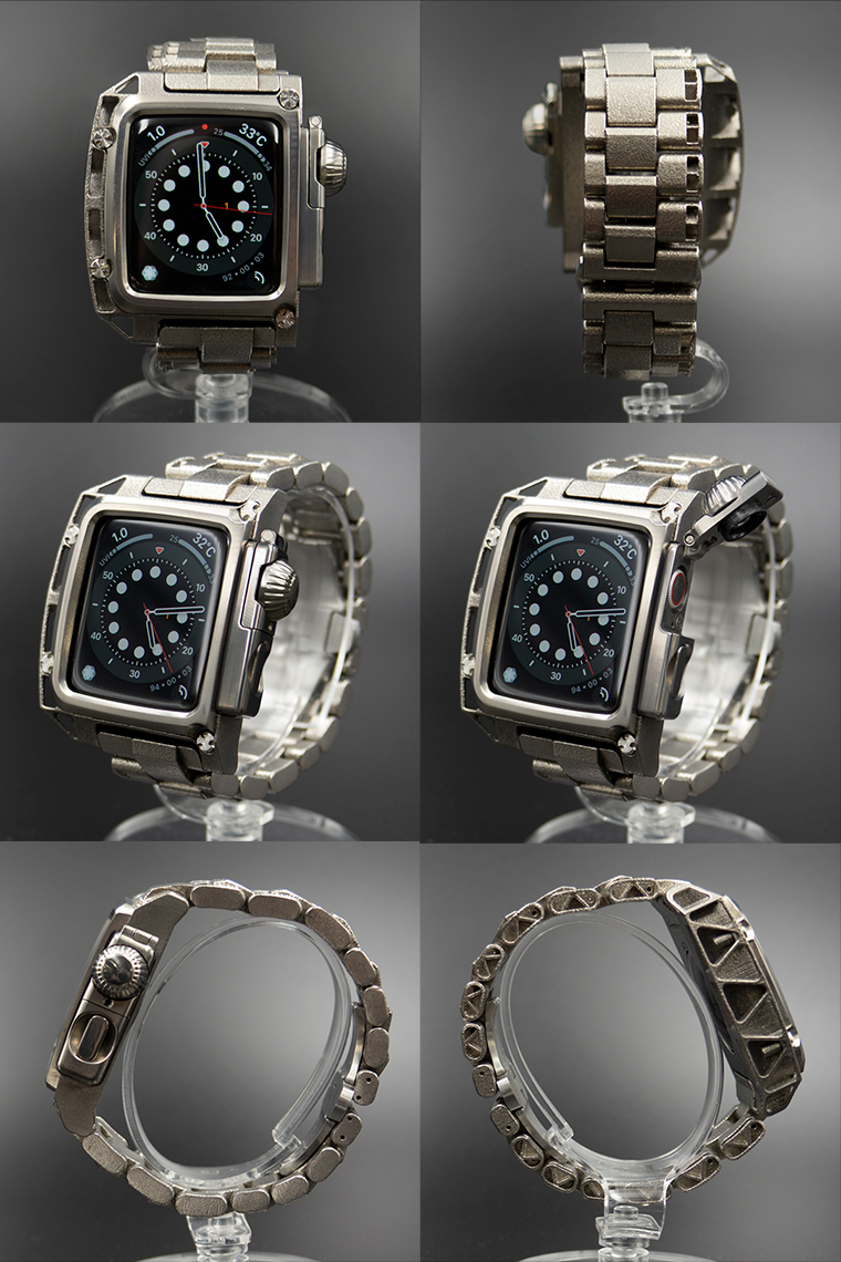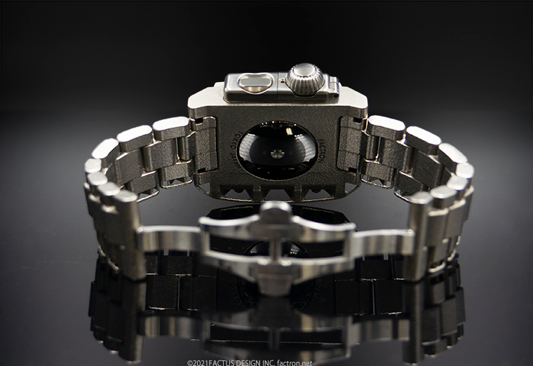 <メタルモデル> ケースとメタルバンドの素材は、純チタニウム。 ケースとメタルバンドは3Dメタルプリントで製造、なめらかに腕になじみます。 ベゼルとクラウンカバー、ボタンカバーはチタニウム材から削り出しました。 3Dチタンメタルプリントによるメタルバンドは、1駒1駒のプリント精度が 曖昧なため、一般的な金属製のメタルバンドとはかなり使用感が異なり、 大きくクリアランスをとっています。また、バンドの駒同士のアジャストも 一般的なメタルバントとは違い、全てバネ棒による駒つなぎの構造なので 駒同士が緩めにつながっているため、やさしい着け心地です。 ネジとバックルは錆びにくく強度のある、ステンレススチール製です。