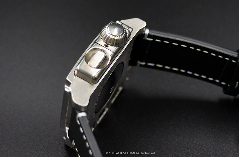 <レザーモデル> ケースの素材は、純チタニウム。3Dメタルプリントで製造。 ベゼルとクラウンカバー、ボタンカバーはチタニウム材から削り出しました。 レザーバンドは、しっかりと厚みがあるエイジング処理されたつや消し(マット調)の皮革です。 着脱しやすい観音開きのワンタッチバックル付き。 ネジとバックルは錆びにくく強度のある、ステンレススチール製。