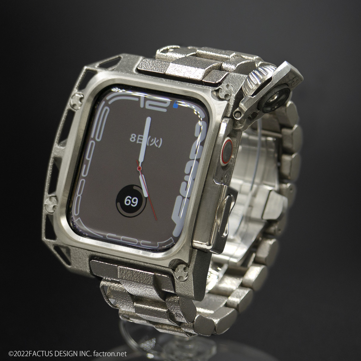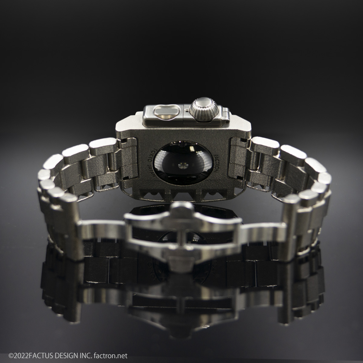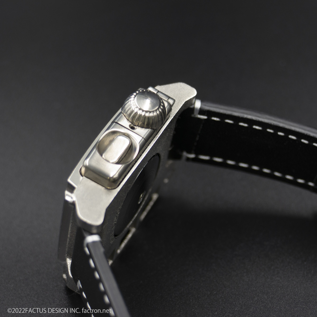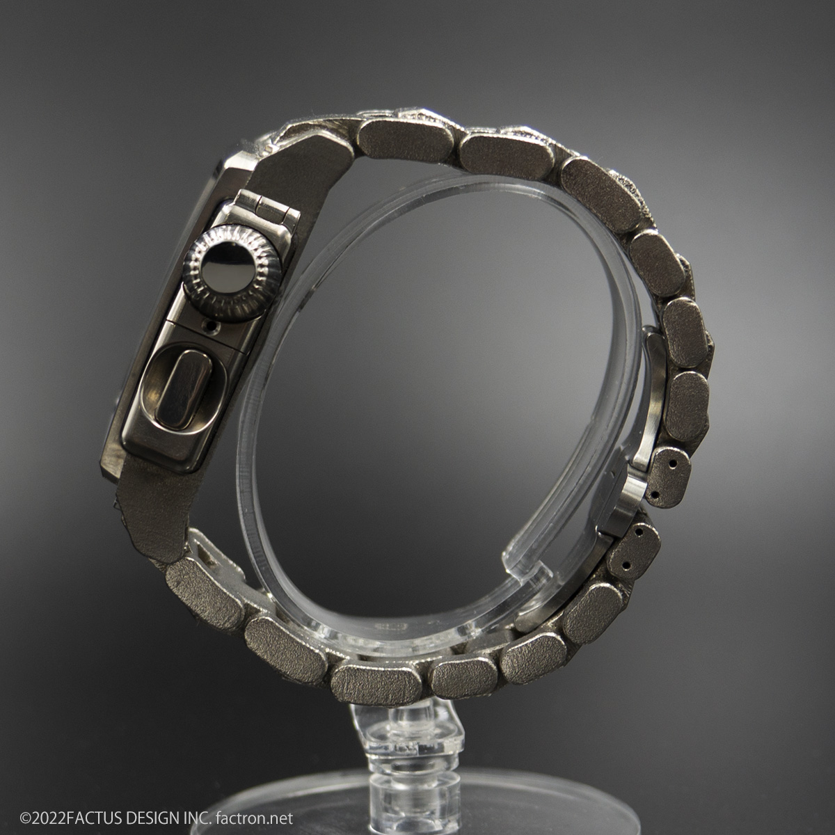 素材は オール純チタニウム。 世界でも稀な、金属粉末3Dプリント と 削り出し加工 の 今までにない融合。 片側でそれぞれ大きく印象が違うアシンメトリーなデザイン。 長年ウォッチデザインを手がけてきたFACTRONのデザイナーが じっくりと吟味しながら作り上げた、オンリーワンの個性的なAppleWatchケース。 重厚なデザインながら非常に軽量。軽やかな着け心地です。 ネジとバックルは錆びにくく、強度のあるステンレススチール製。