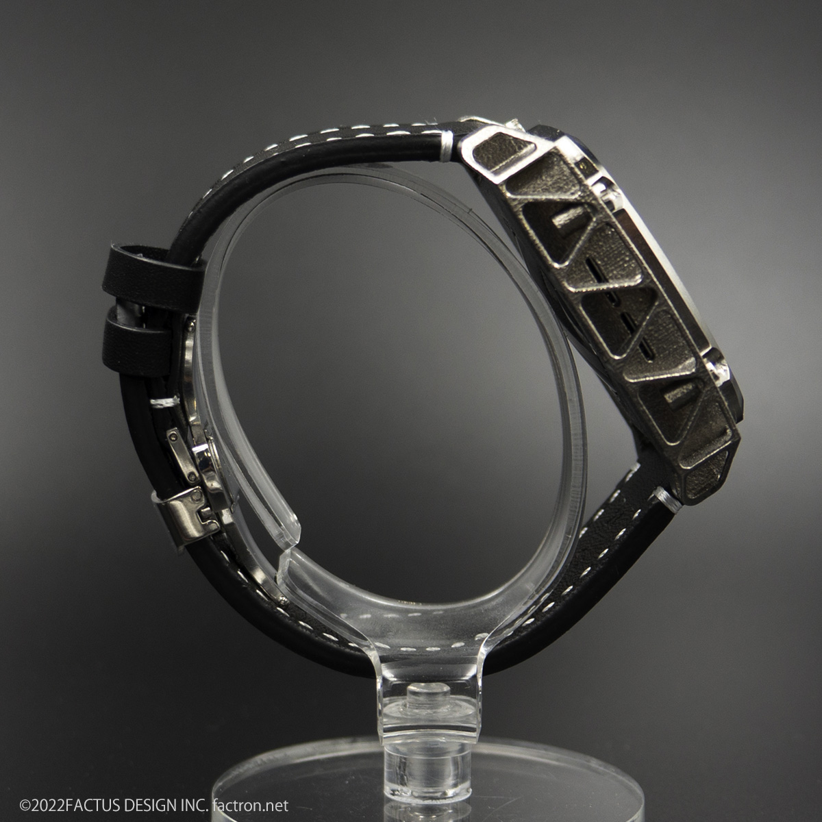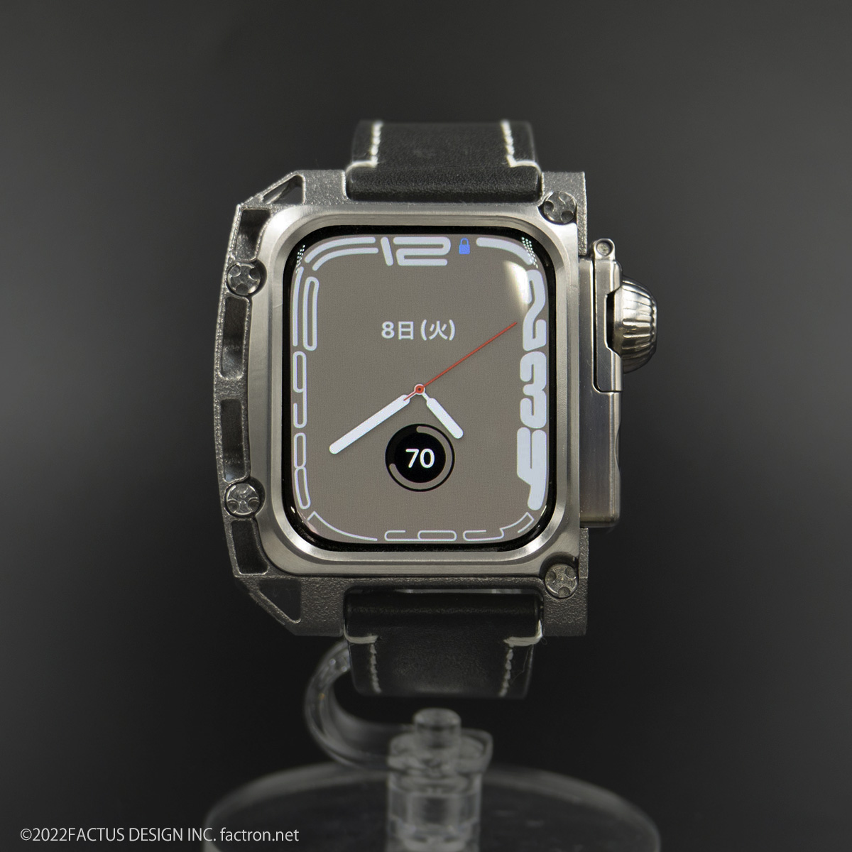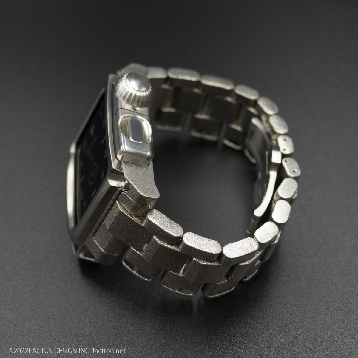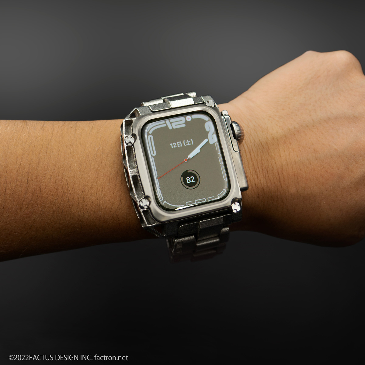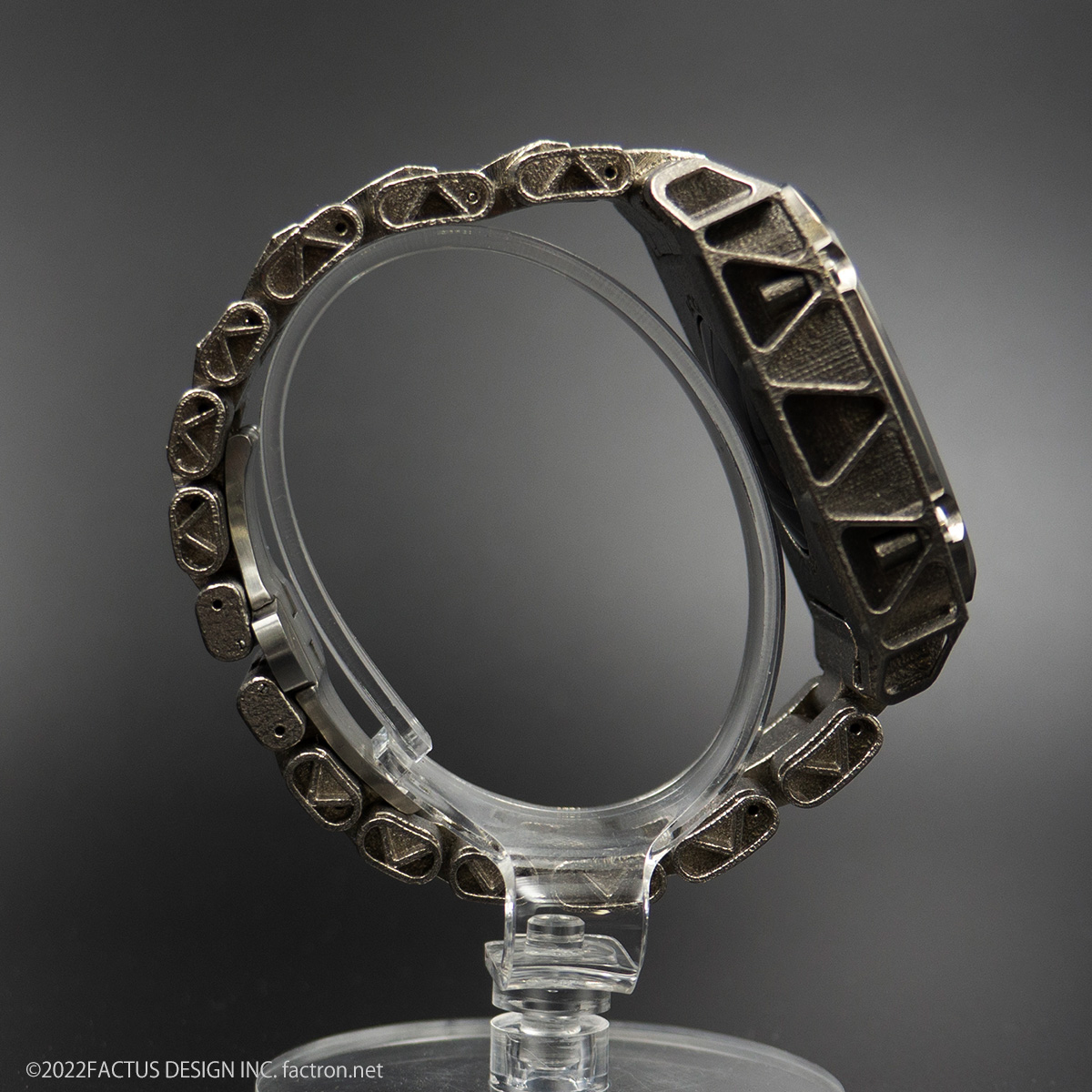 素材は オール純チタニウム。 世界でも稀な、金属粉末3Dプリント と 削り出し加工 の 今までにない融合。 片側でそれぞれ大きく印象が違うアシンメトリーなデザイン。 長年ウォッチデザインを手がけてきたFACTRONのデザイナーが じっくりと吟味しながら作り上げた、オンリーワンの個性的なAppleWatchケース。 重厚なデザインながら非常に軽量。軽やかな着け心地です。 ネジとバックルは錆びにくく、強度のあるステンレススチール製。